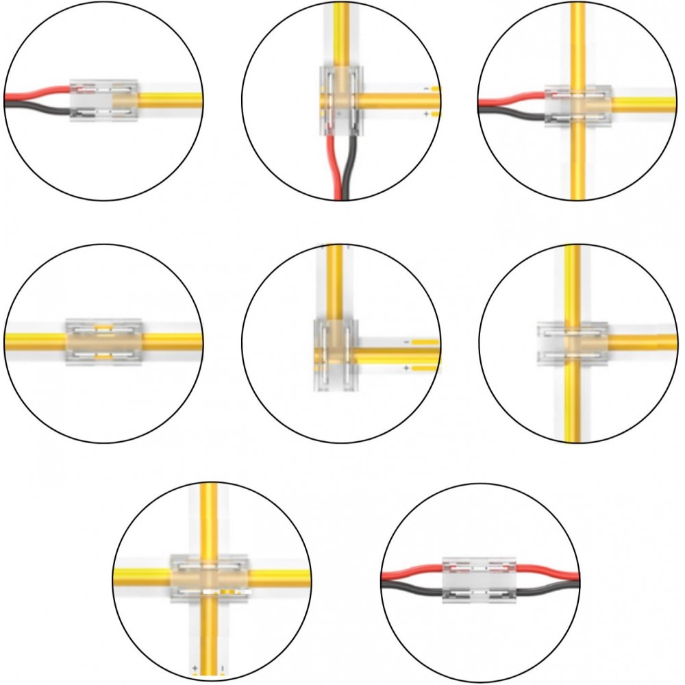 Le conseil ByLED : Pour les jonctions en T et en X, le ruban principal, qui traverse le connecteur perpendiculairement aux deux dents métalliques, doit impérativement passer entièrement à travers le connecteur, sans être sectionné, afin d'assurer son allumage complet. Veillez à ce que les dents métalliques du connecteur 8en1 soient alignées avec les pistes de cuivre du ruban LED avant de les pincer.
