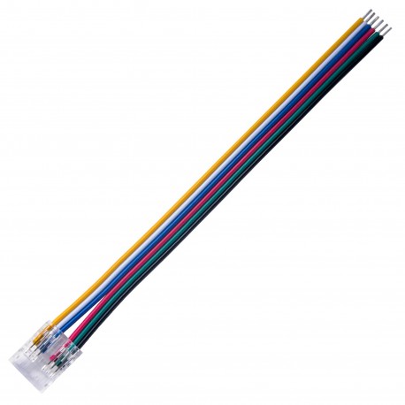Vous avez découper votre ruban LED COB RGB+CCT et il vous manque des câbles pour relier votre ruban LED à un contrôleur ? Ce connecteur est la solution idéale pour éviter la soudure. Il se fixe rapidement à l'extrémité du ruban, au niveau des repères de coupe, et fournit un câble de 15cm pour raccorder facilement un contrôleur.