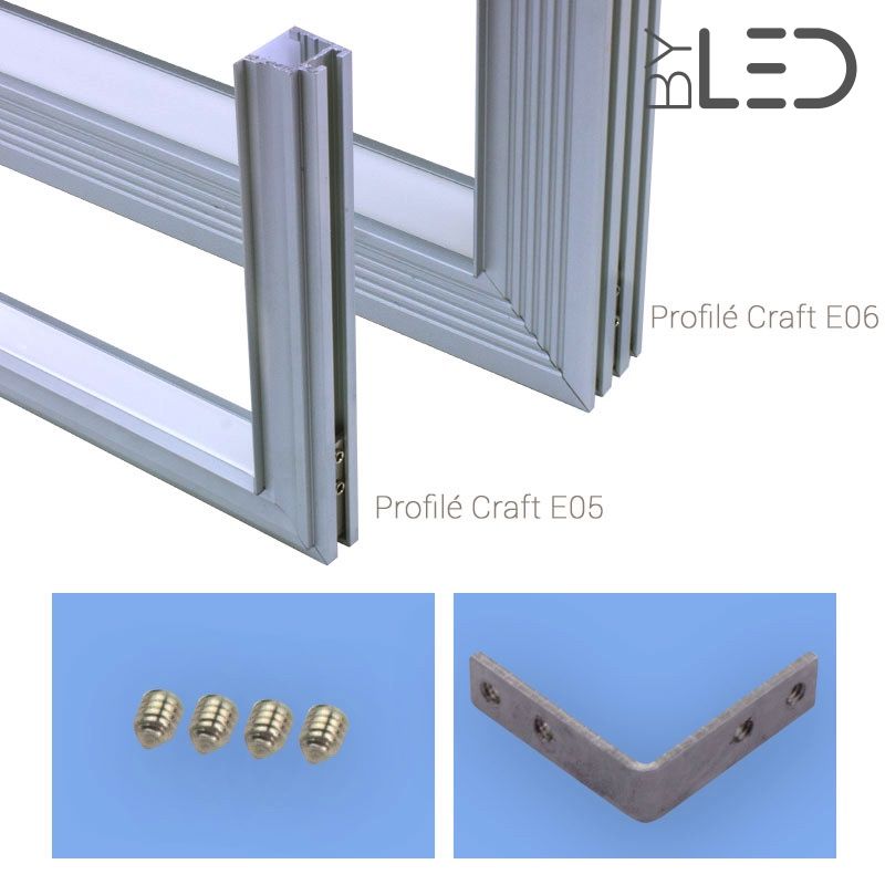 Pour cela, il convient de scier vos profilés Craft E05 ou E06 en angle de 45° afin de les joindre correctement, formant ainsi un angle à 90° puis de les assembler grâce à la jonction.