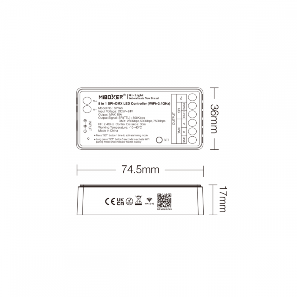 Ce contrôleur Miboxer SPIW5 est uniquement compatible avec la télécommande MiBoxer C9 que vous retrouverez en cliquant ici.