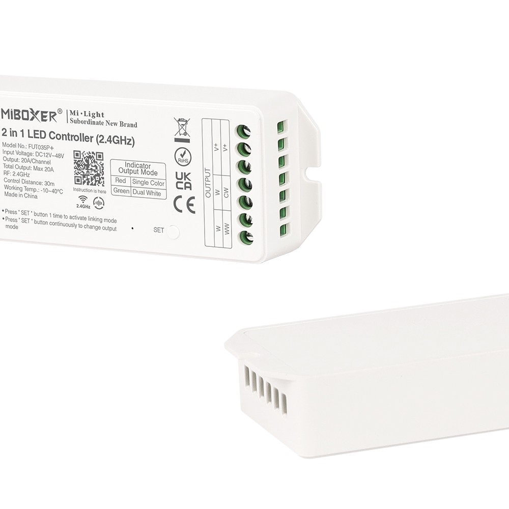 Ce contrôleur MiBoxer 2 en 1 offre des possibilités d'utilisation variées sur un ruban LED blanc ou CCT. Avec une capacité de sortie allant jusqu'à 960W, ce contrôleur miboxer permet de diriger l'intensité lumineuse et la température du blanc. 2 modes d'éclairage vous sont proposés :