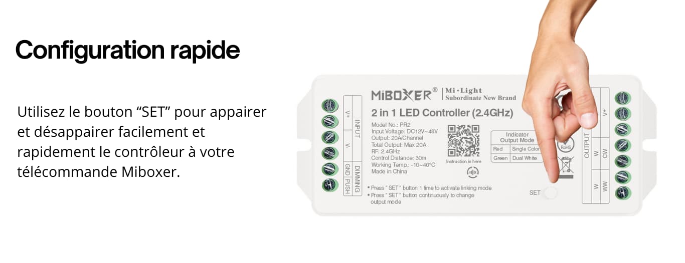 L’association de votre contrôleur MiBoxer PR2 avec votre télécommande MiBoxer permet de contrôler facilement votre éclairage LED. Vous pouvez gérer votre ruban LED pour l'allumer, l'éteindre, ajuster l’intensité lumineuse depuis la télécommande et ce jusqu'à 30 mètres de distance. Une seule télécommande peut être connectée à plusieurs contrôleur Miboxer, ce qui vous permet de différencier l'éclairage en fonction des zones de votre maison. À l'inverse, vous pouvez connecter jusqu'à 12 télécommandes à ce contrôleur Miboxer PR2.