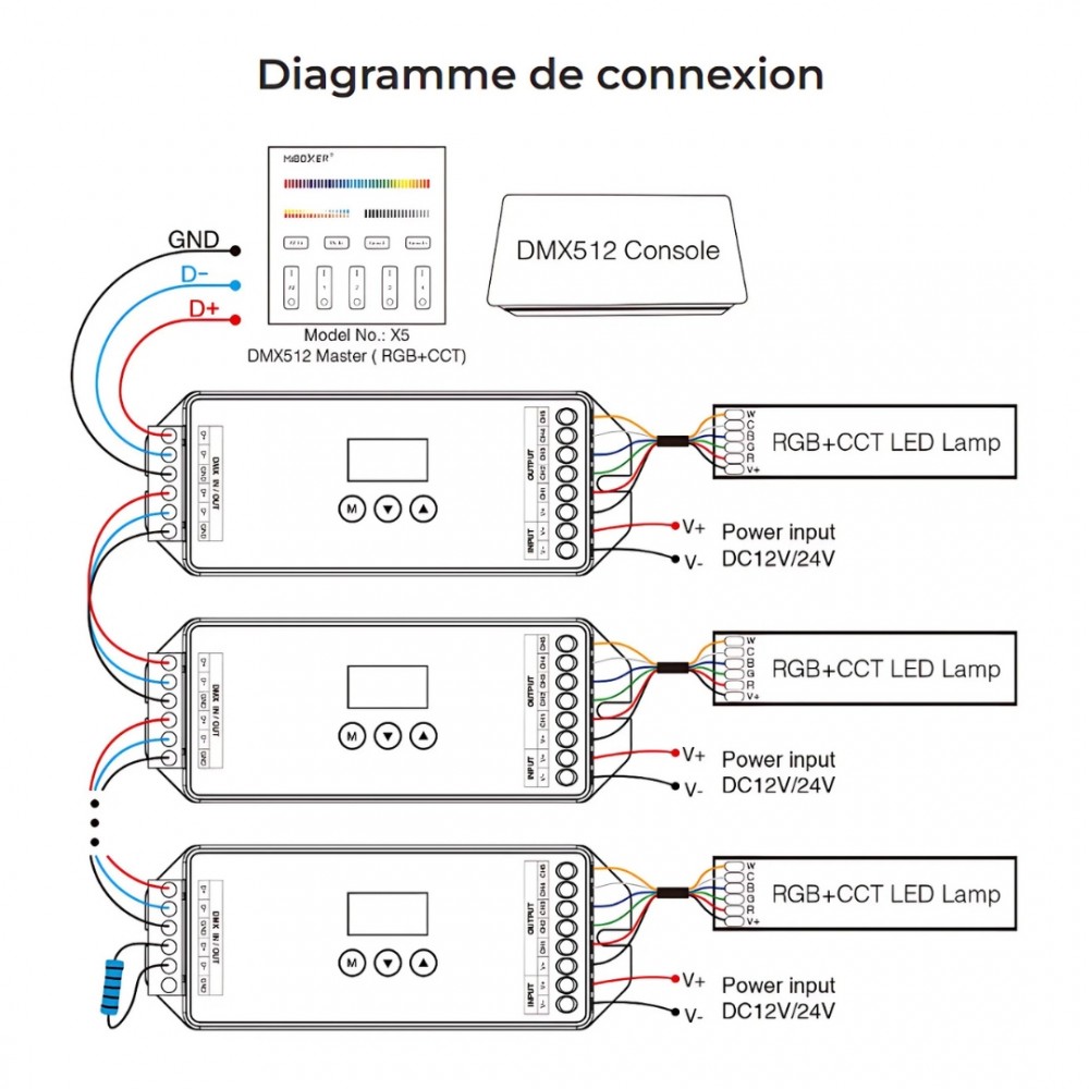 Le contrôleur MiBoxer D5-CX se connecte à une console DMX ou une télécommande murale MiBoxer X4, et peut être combiné avec d’autres modèles de la gamme selon les besoins :