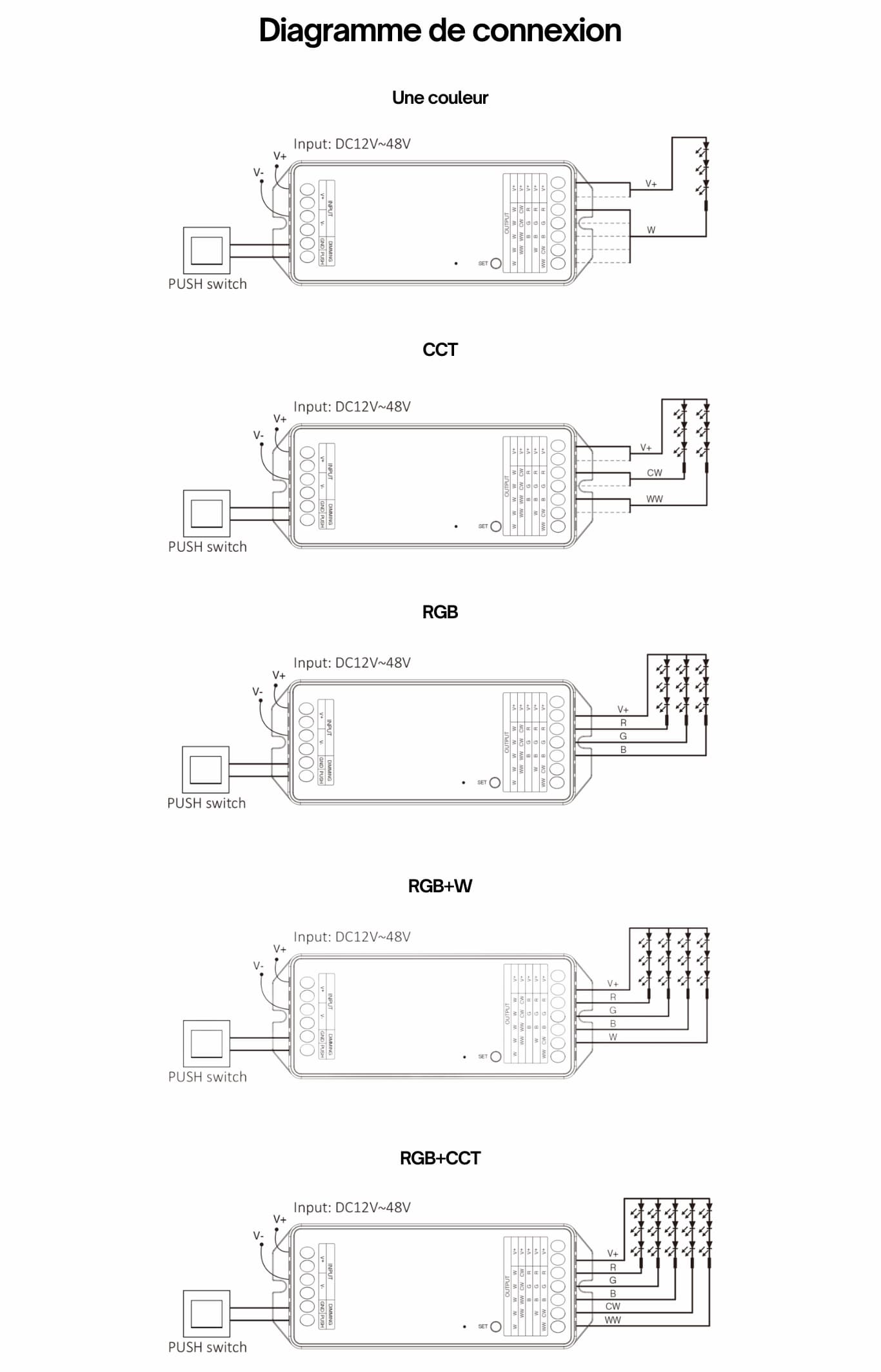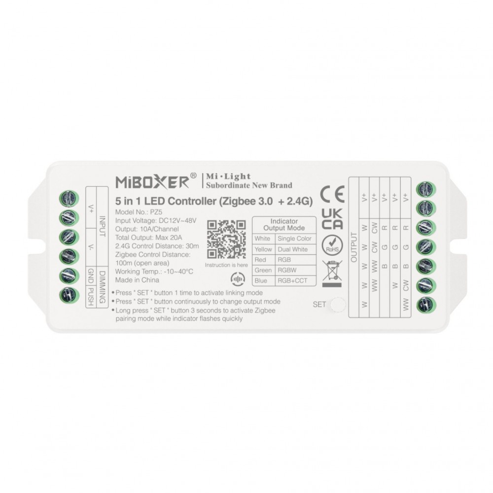 Le contrôleur MiBoxer 5 en 1 offre une flexibilité d'utilisation impressionnante. Avec une puissance de sortie maximale de 960W, il permet de piloter l'éclairage de divers types de rubans LED allant du 12 au 48 volts, dans des environnements comme des maisons, des commerces ou des hôtels. Commutation de 5 modes de sortie via un seul bouton, découvrez les 5 types d’éclairage proposés par ce modèle polyvalent :
