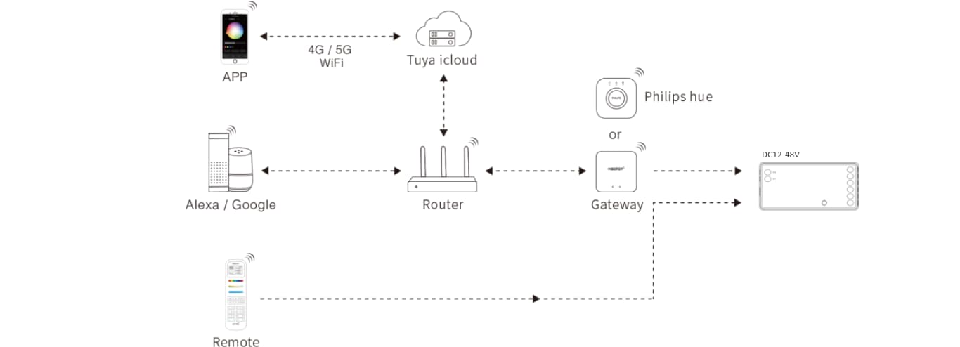 Pour piloter votre ruban avec un smartphone, une tablette ou un assistant vocal, vous aurez besoin de connecter votre contrôleur Zigbee 3.0 Miboxer 5 en 1 à une passerelle Zigbee (non fournie).