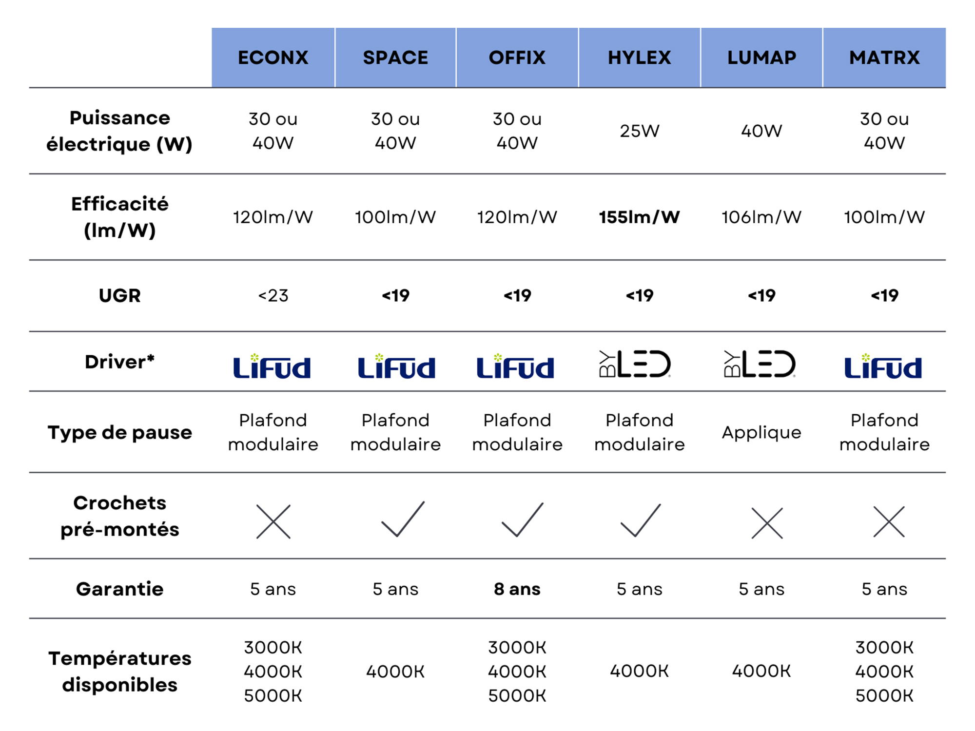 *Le driver varie en fonction du modèle de dalle : Lifud pour les versions non dimmables et AiDimming pour les systèmes DALI ou Triac.