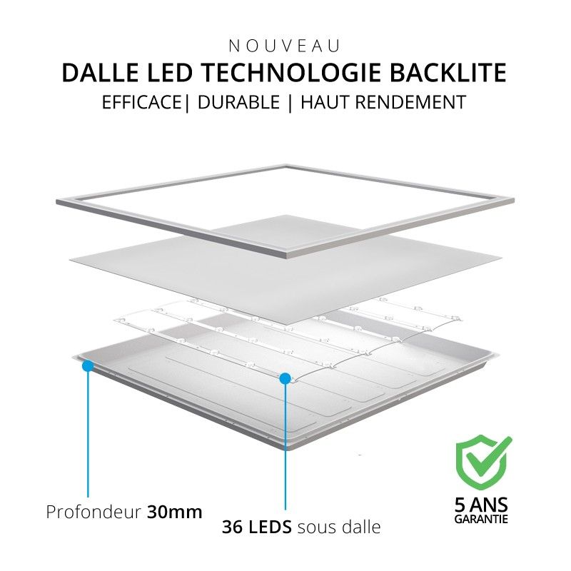 On apprécie particulièrement la lumière puissante et homogène que délivre ces dalles LED 600x600, notamment grâce à sa technologie Backlite qui permet d'obtenir une efficacité de 100 lumens par Watts et un angle de diffusion étendu sur 120°.