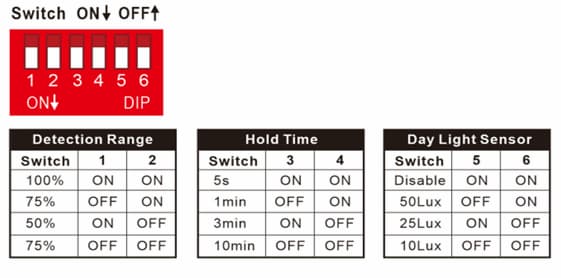 Selon vos besoins, vous pouvez faire varier ces trois modes : portée de détection, réglage de la luminosité ambiante et la durée d'allumage. Veillez à ce que votre installation soit bien hors tension lorsque vous souhaitez changer les modes.