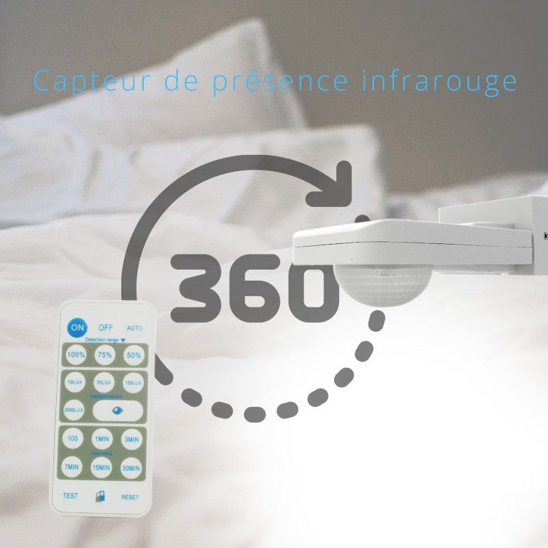 Une télécommande permet d'effectuer les réglages de ce détecteur de présence (durée, sensibilité, seuil de déclenchement, test, marche forcé, arrêt forcé, RAZ).