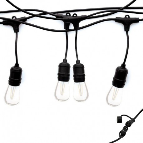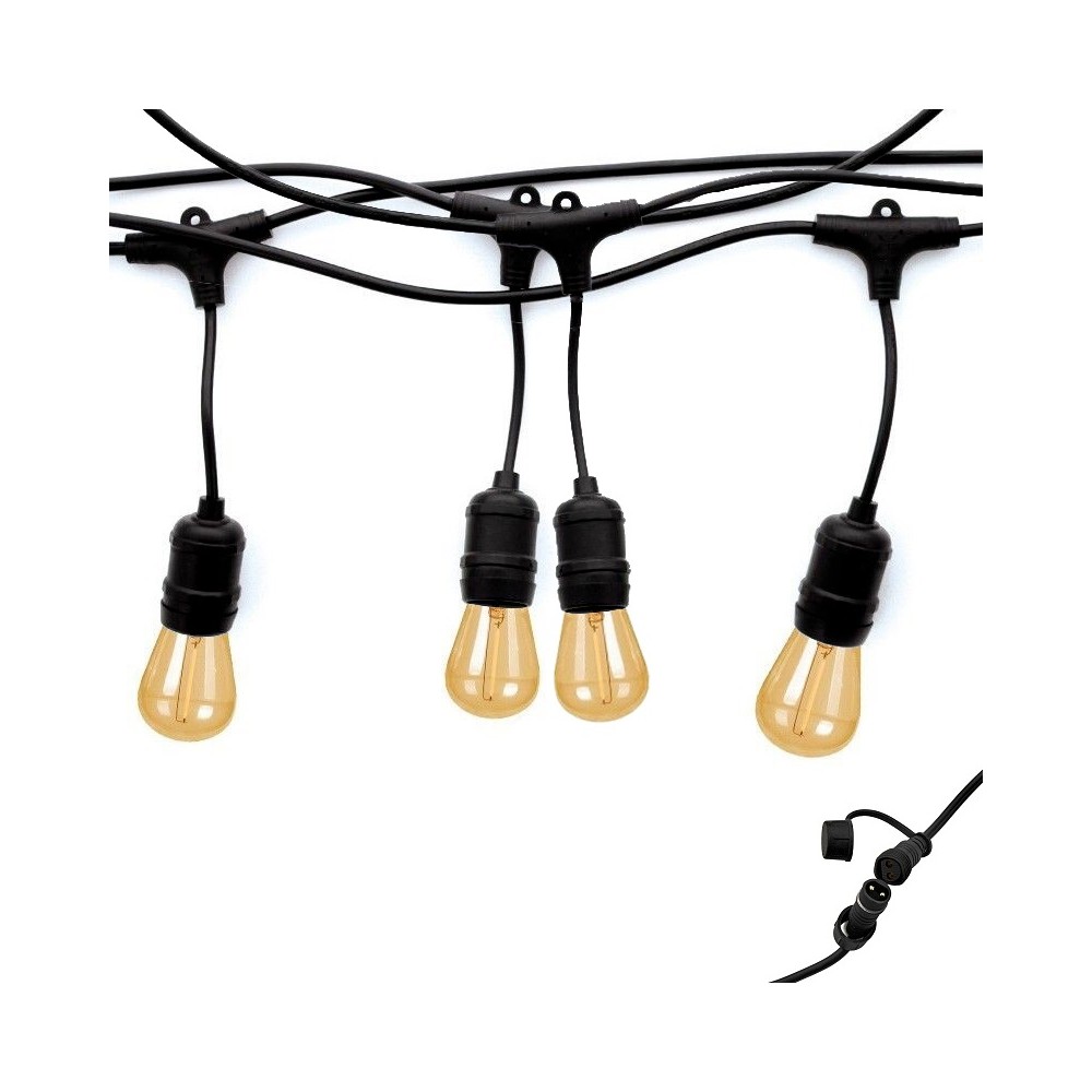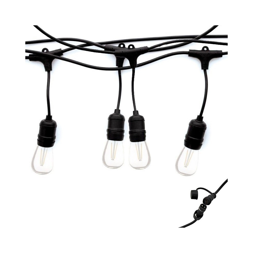 Vous pouvez ajouter d'autres guirlandes "Conex" de 5 mètres dans la continuité de la première, comme une rallonge jusqu'à 200 mètres et 500 watts maximum. Cette guirlande ByLED "Conex" inclus des raccords étanches IP65 spécifiques et totalement étanche aux intempéries.