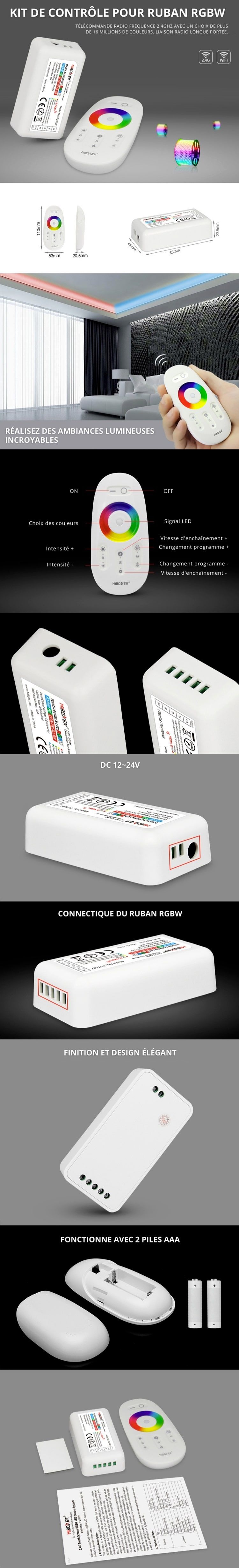 Ce kit télécommande vous permet de créer des ambiances lumineuses en mélangeant les 3 couleurs (Rouge, Vert et Bleu) de vos rubans LED RGB et spots LED RGB.