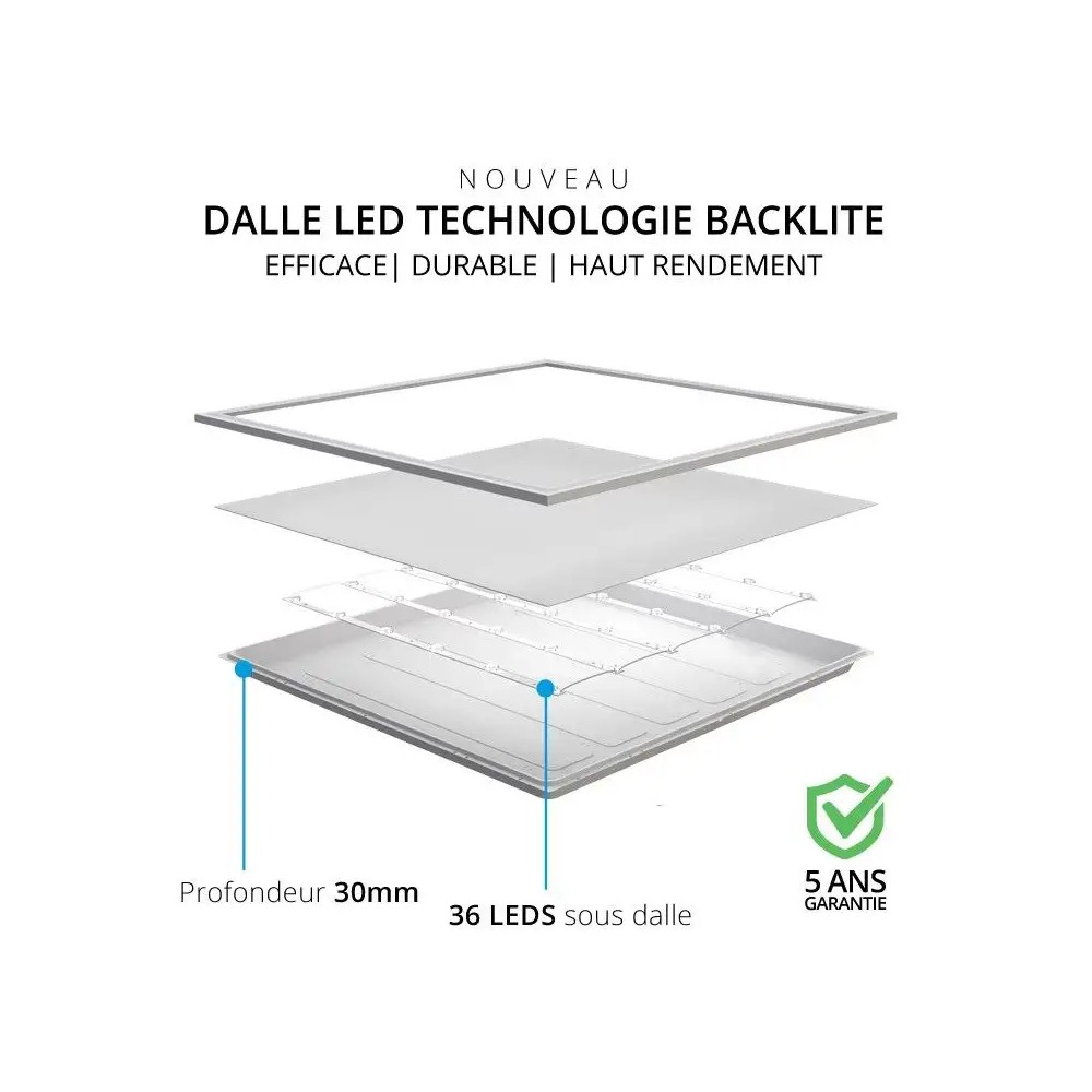 On apprécie particulièrement la lumière puissante et homogène que délivre ces dalles LED 600x600, notamment grâce à sa technologie Backlite qui permet d'obtenir une efficacité lumineuse et un angle de diffusion étendu sur 120°.