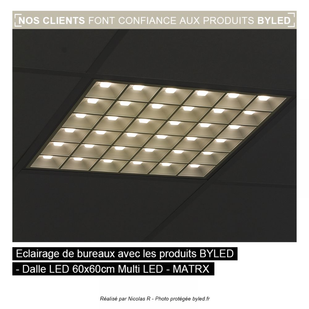 Les 36 diffuseurs microprismatiques permettent sur ces dalles une diffusion parfaitement homogène de la lumière, mettant de côté tout risque d'éblouissement (UGR < 19). Les panneaux LED ByLED proposent un Indice de Rendu des Couleurs (IRC) de 80 et sont équipés de transformateurs Lifud ® sans scintillement.