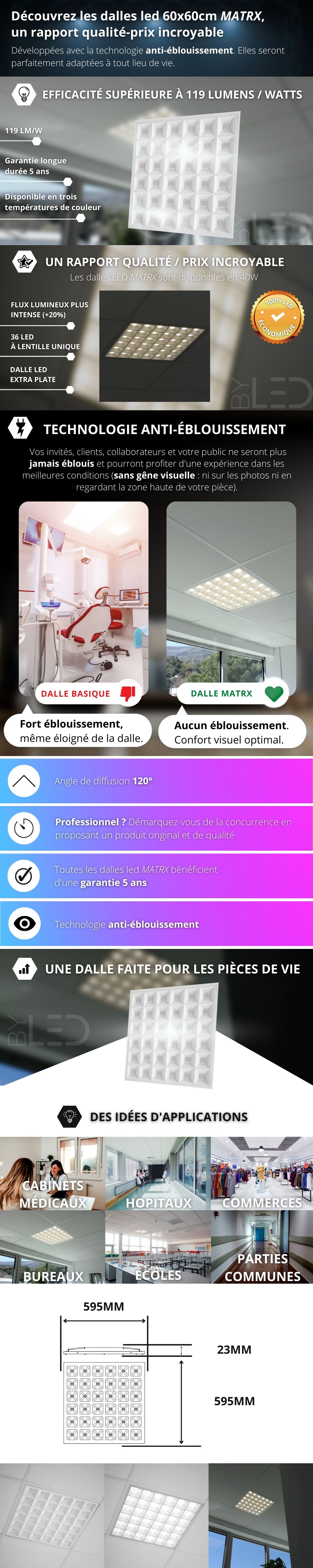 Les panneaux multi LED Matrx offrent une véritable avancée technologique comparé aux anciennes installations de type néons fluo ou à des produits LED "bas de gamme" d'ancienne génération ne respectant pas les nouvelles normes en vigueur.