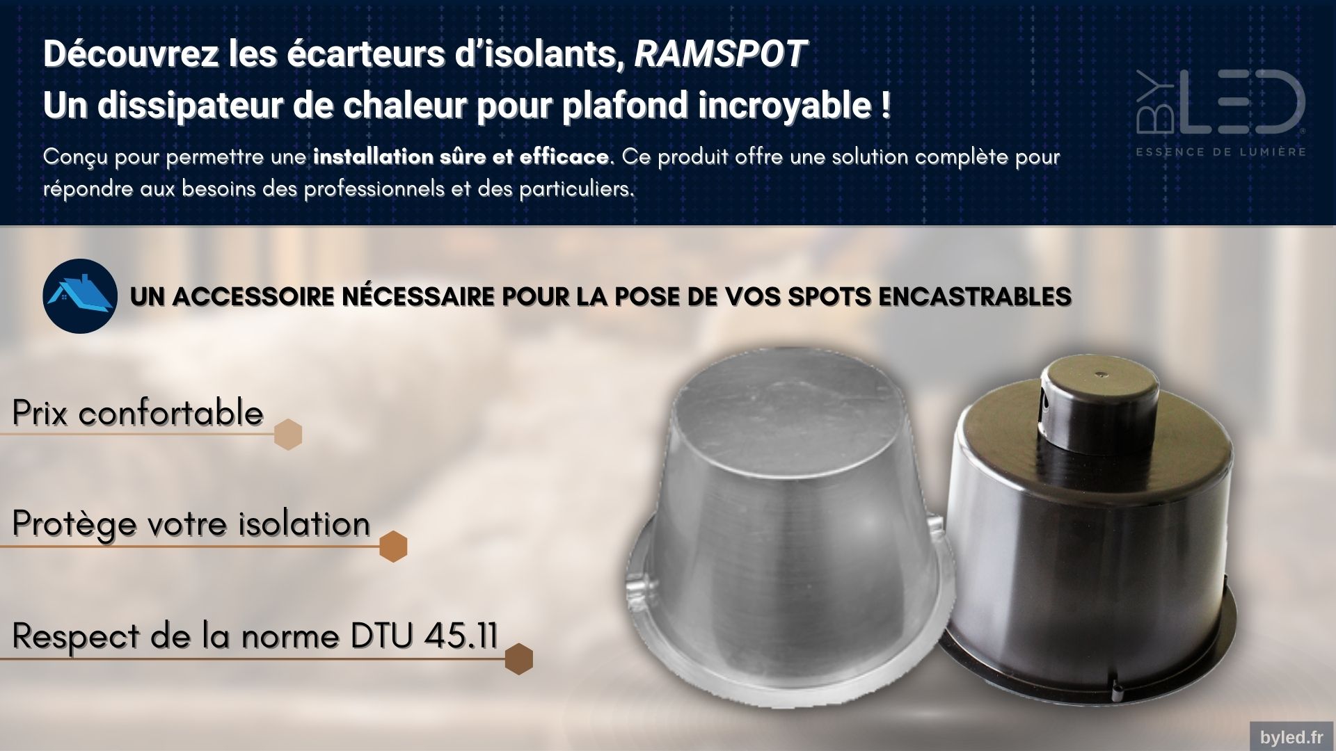 Si vous recherchez une solution d'installation encore plus simple pour vos spots LED, nos écarteurs "Ramspot" Base, LS ou DL sont la réponse. Plus besoin de passer par les combles, il vous suffit d'insérer les écarteurs dans les trous prévus pour les spots LED, et le tour est joué ! C'est un moyen pratique et rapide d'obtenir un éclairage encastré de qualité, sans tracas ni souci. Attention, les "Ramspot" Base, LS ou DL ne sont pas conformes au nouveau DTU 45.11 sur l'isolation soufflée, ils sont à utiliser pour des projets d'isolation en panneau ou en rouleau.