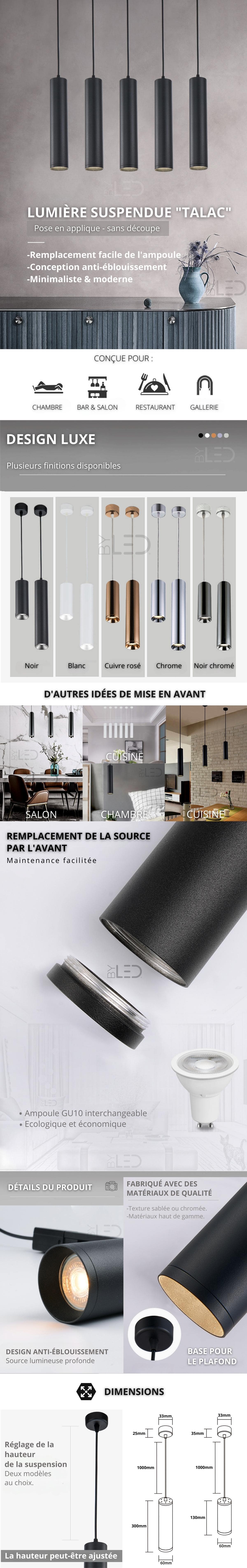Utiliser un éclairage LED, c'est faire un choix économique grâce à une très faible consommation électrique, respectueuse de l’environnement. D'autant plus, que notre gamme de suspensions LED "TALAC" permet de changer la source LED GU10 très facilement. Ainsi, si vous souhaitez changer votre ampoule, vous n'aurez pas à changer la suspension entièrement, quelques minutes suffiront à remplacer la lumière de ce luminaire suspendu !
