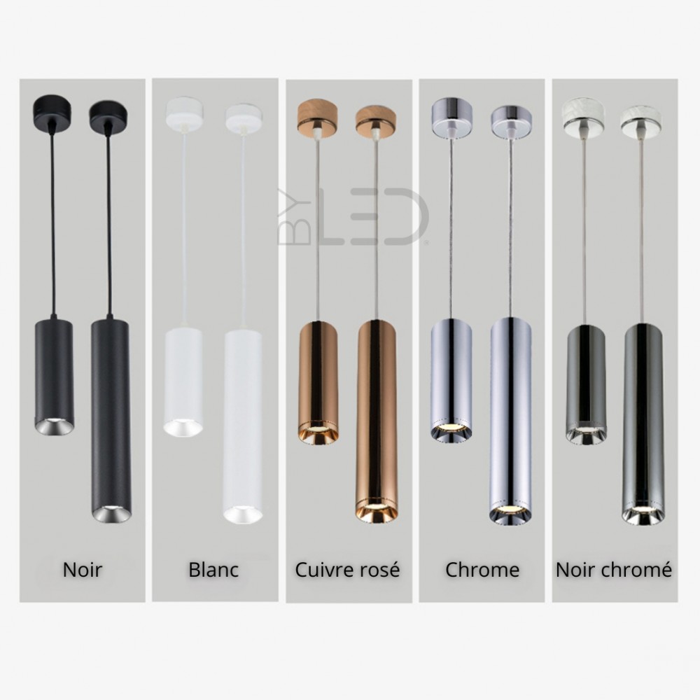 Cette suspension existe en deux tailles différentes (115 ou 130 cm) et dans les finitions suivantes : chrome, cuivre rosé, noir chromé, noir sablé et blanc sablé. Cliquez-ici pour découvrir les autres produits de la gamme des suspensions "TALAC".