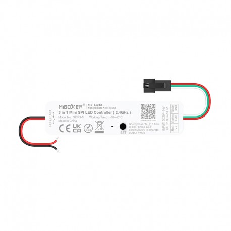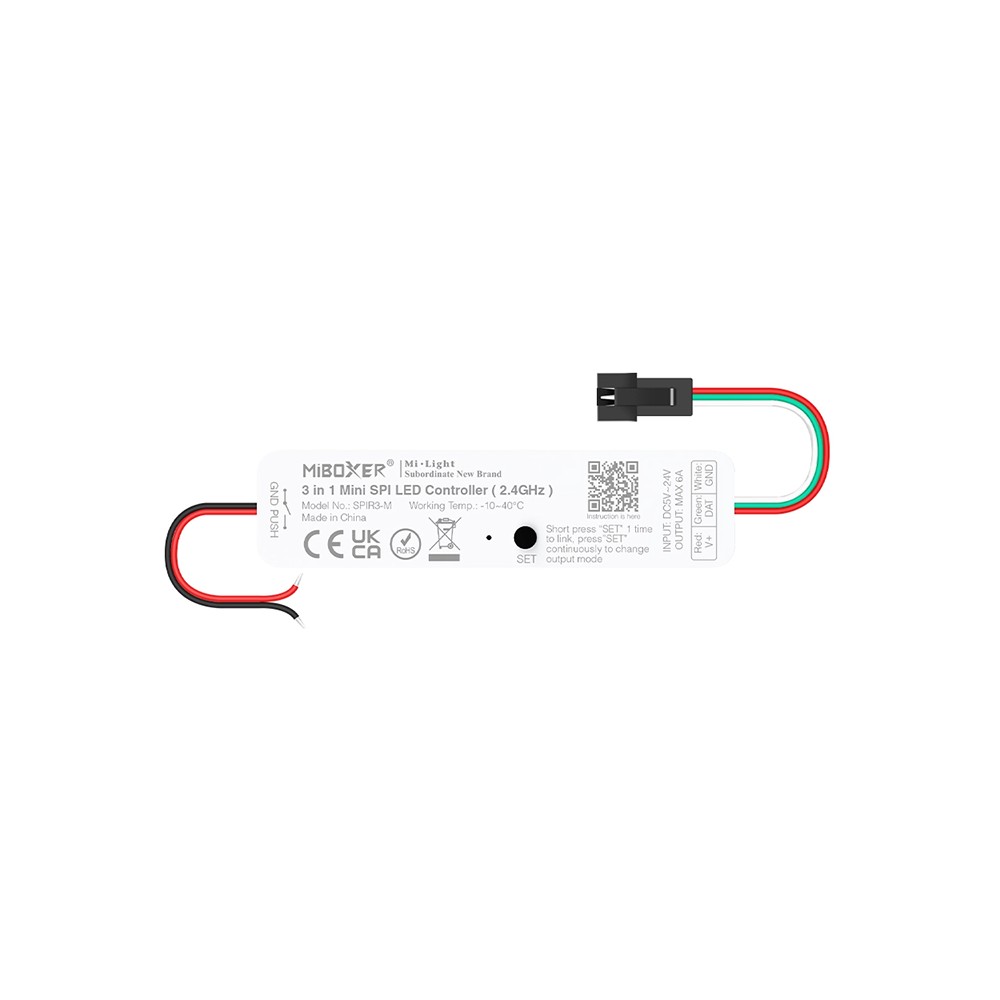 Le mini contrôleur digital MiBoxer SPIR3-M est conçu pour une installation rapide grâce à sa sortie avec connecteur, permettant une connexion simple à nos rubans LED digitaux. Compatible avec des rubans LED fonctionnant en 5V à 24V, il offre une gestion complète de l’éclairage pouvant aller jusqu'à 144W.