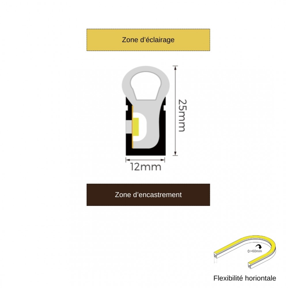 Avec le ruban néon flex L1225, plus besoin d’insérer un ruban LED, celui-ci est directement intégré dans la gaine flexible, ce qui facilite l’installation et garantit une finition propre et professionnelle. Ce ruban LED intégré est dimmable, c’est-à-dire que son intensité lumineuse peut être varié en fonction de vos besoins. Que vous souhaitiez une lumière faible pour créer une ambiance apaisante ou un éclairage plus puissant pour un usage fonctionnel, vous pouvez adapter la luminosité à tout moment à l’aide d’un variateur, d'un contrôleur ou d'un transformateur.