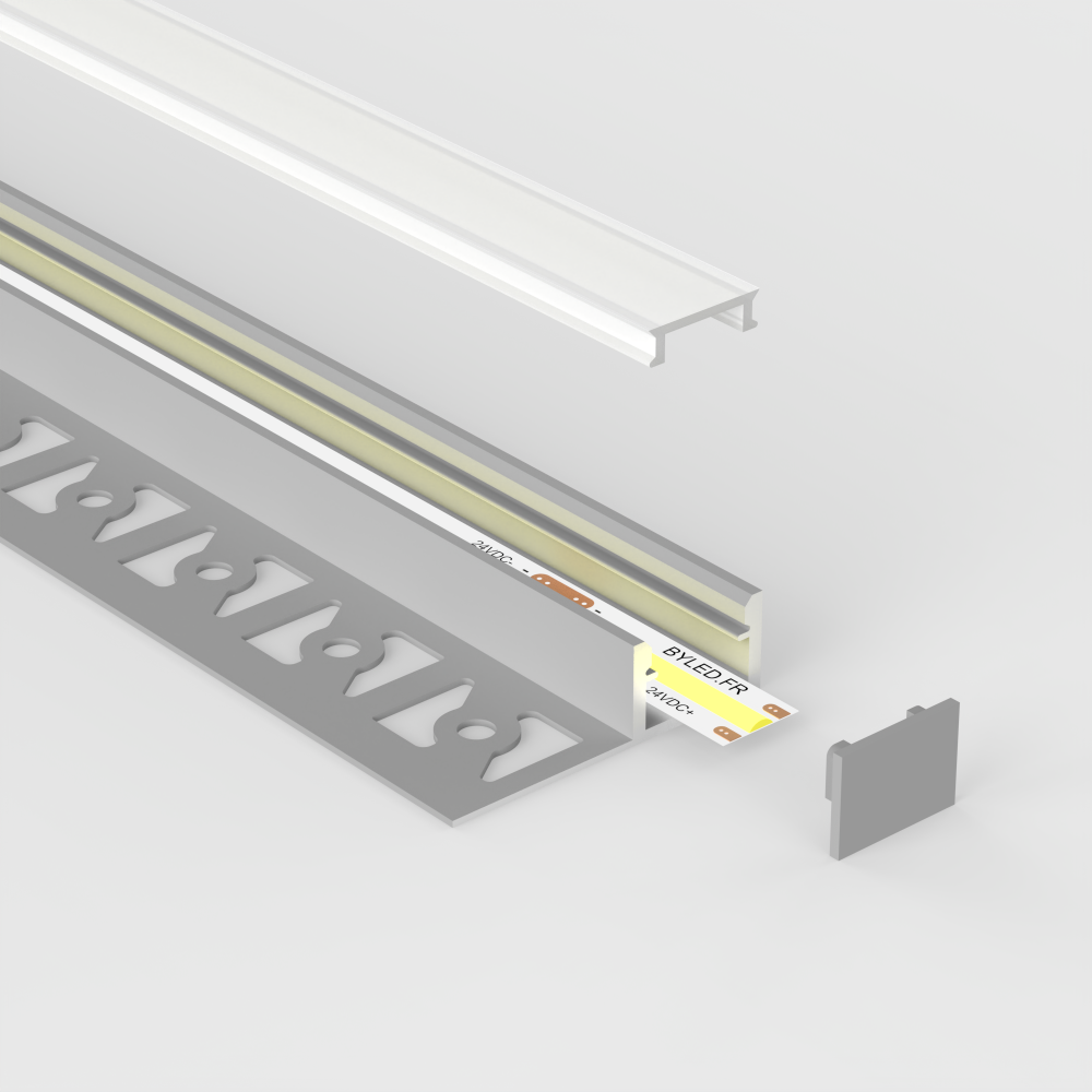 Ce profilé en aluminium s’encastre à la fin ou au départ, dans un mur ou dans un sol.