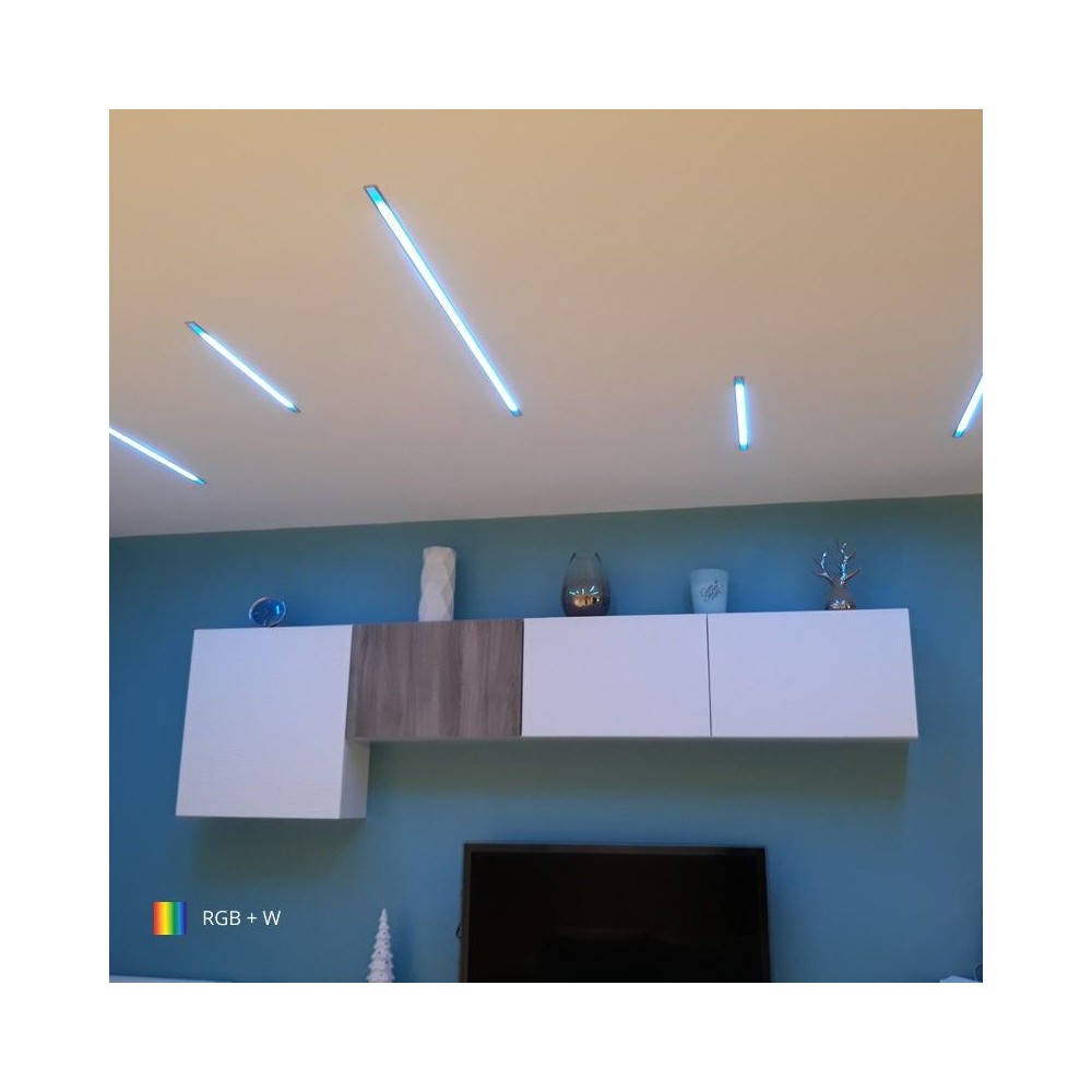 Ce profilé s’installe de la même manière qu’un spot encastrable grâce aux clips de fixation fournis à raison de deux par mètre de profilé. Le ruban quant à lui, se colle à même le profilé, dans l’espace prévu à cet effet, sous le diffuseur. Ce dernier, livré avec votre profilé, est givré, gommant ainsi l’espace entre les LED pour un rendu lumineux tout à fait homogène.