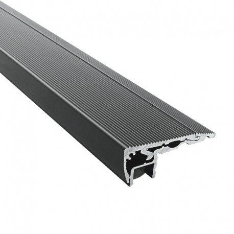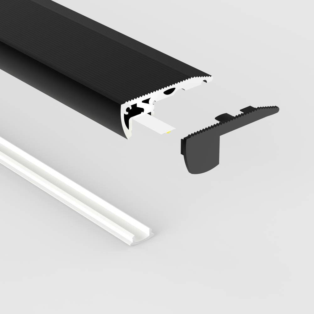 Ce profilé en aluminium laqué noir pour ruban LED est spécialement conçu pour éclairer les contre-marches d’escalier, en se fixant au nez de marche par vissage et/ou collage. Les vis sont dissimulés par un couvercle de finition. Également, des embouts sont inclus pour être fixés de chaque côté du profilé afin de parfaire le résultat.
