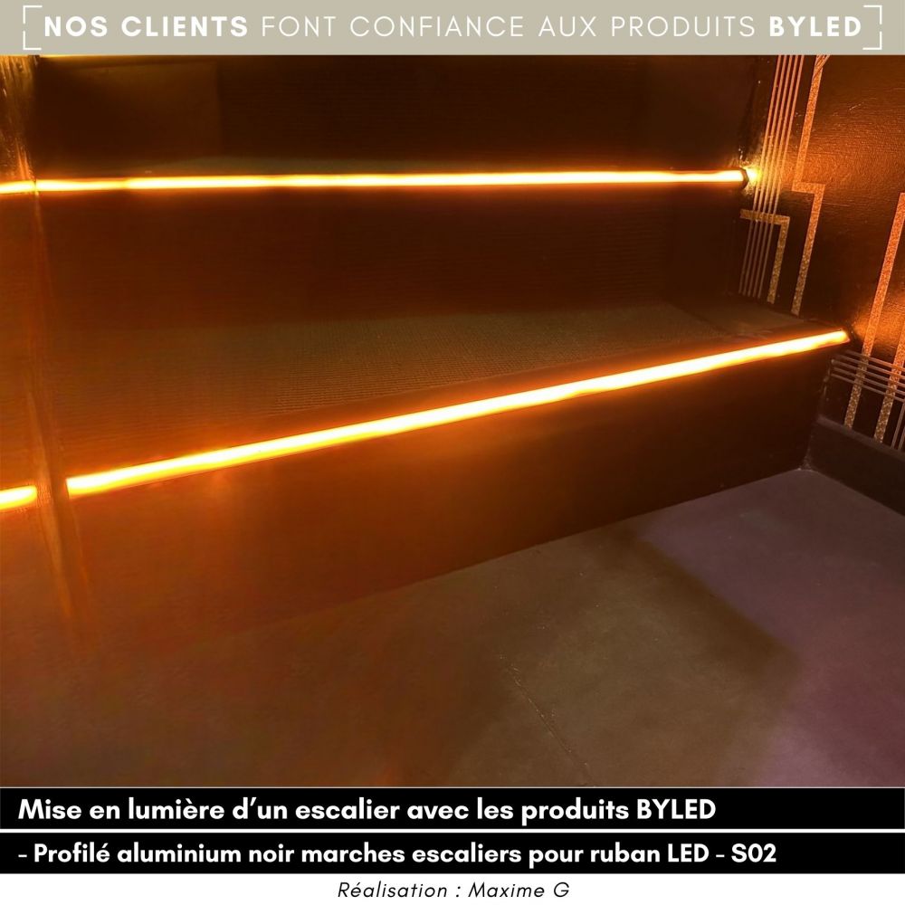 Ce profilé pour ruban LED est à installer aux nez de marches d’escalier, en intérieur, afin de créer un balisage pour chaque marche, permettant d’éviter les mauvaises chutes dans le noir. On apprécie également le rendu final, lorsque toutes les marches sont éclairées.
