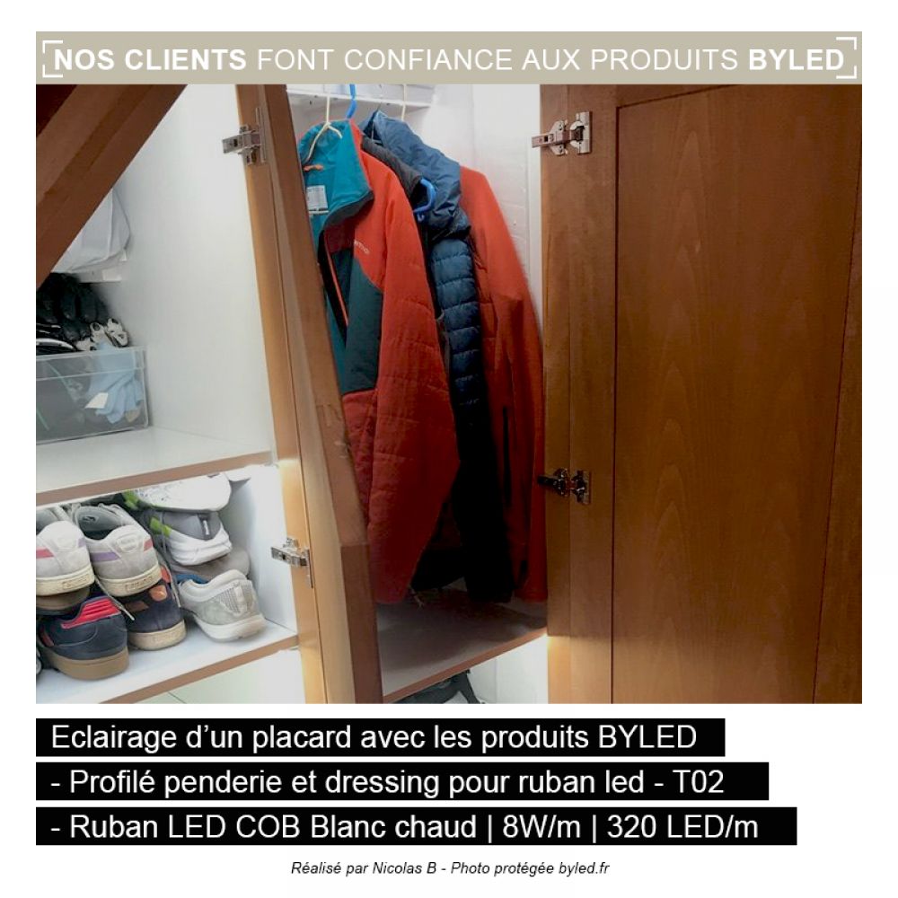 Grâce à ce profilé pour ruban LED, vous pourrez très simplement réaliser des tringles lumineuses afin d'éclairer l'intérieur d'une penderie ou d'un dressing. Pour un éclairage efficace et design, nous vous fournissons le diffuseur opaque, créant une lumière diffuse et constante sur toute la longueur du profilé.