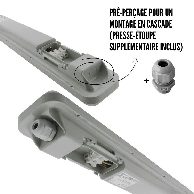 Branchement facilité grâce au 2 connecteurs sans vis situés à chaque extrémité de la réglette permettant un montage aisé en cascade.