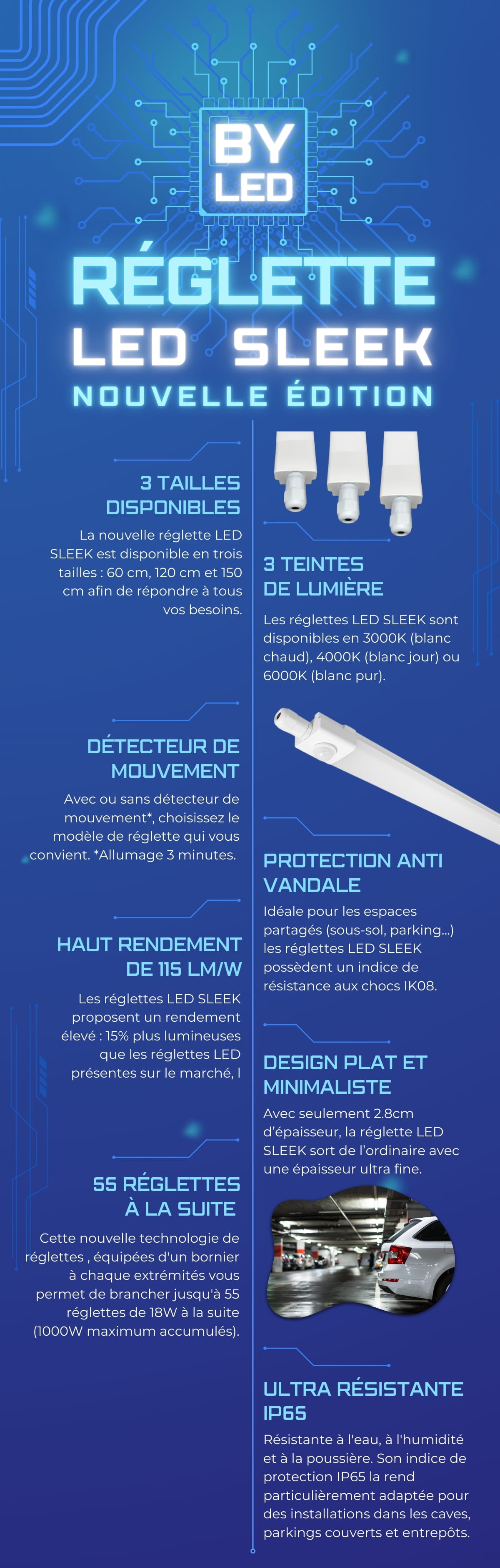 Découvrez la réglette LED ByLED SLEEK, un luminaire intelligent alliant résistance et performance. Équipée d'un détecteur de mouvement infrarouge, cette réglette LED constitue un éclairage idéal pour les espaces nécessitant une gestion optimisée de la lumière, tels que les couloirs, sous-sols ou garages.