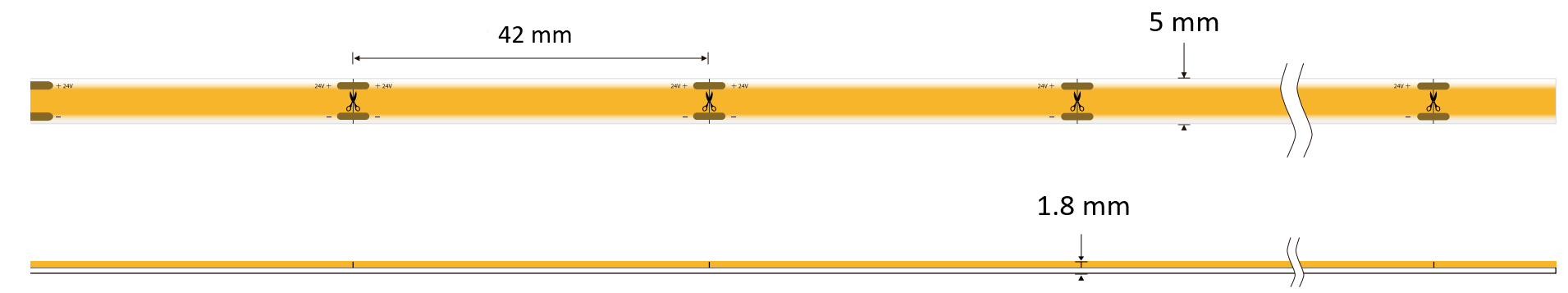 Un ruban LED 24V peut être alimenté jusqu'à 5 mètres avec un seul départ d'alimentation sans perte de luminosité (et jusqu'à 10 mètres avec un départ d'alimentation de chaque côté de votre ruban LED).