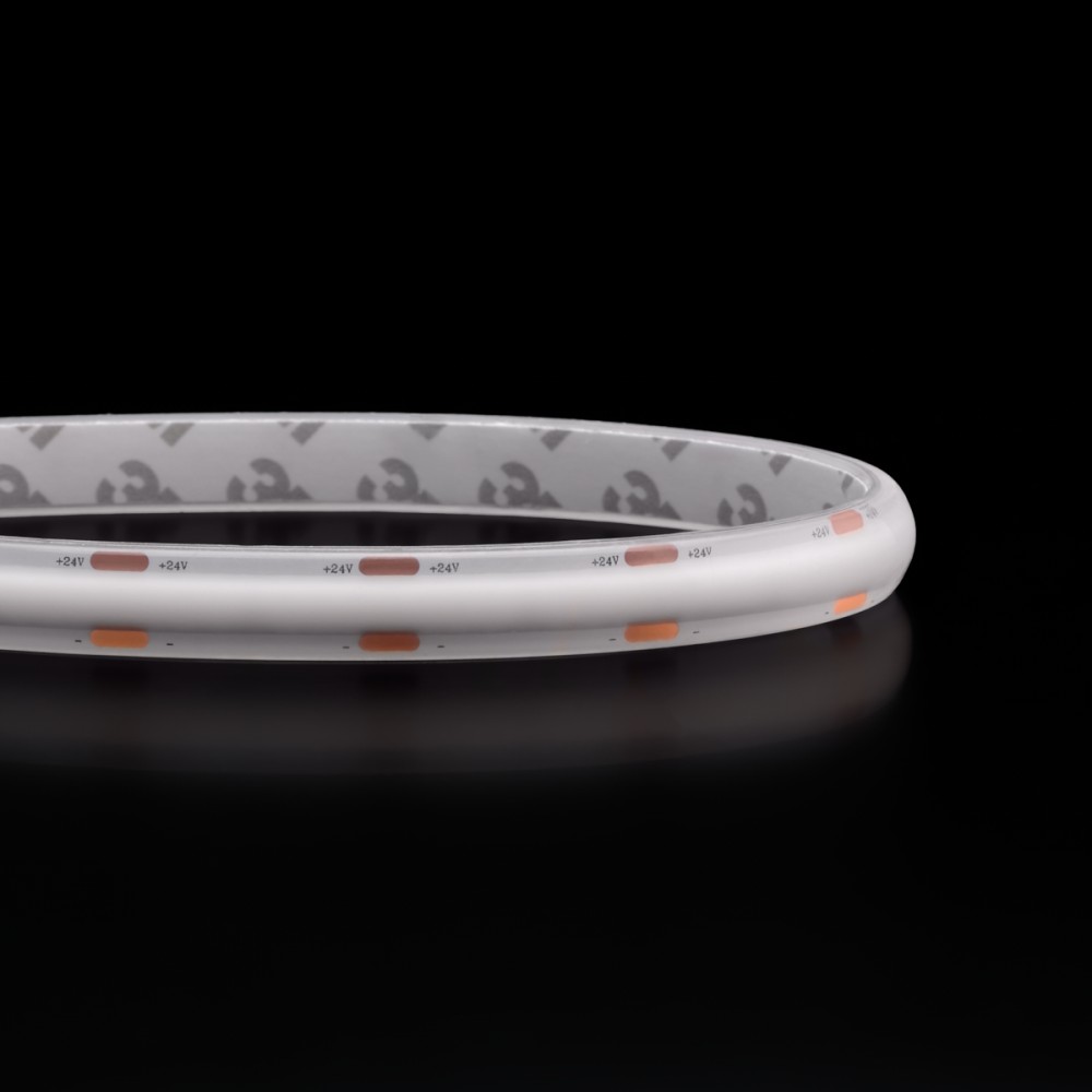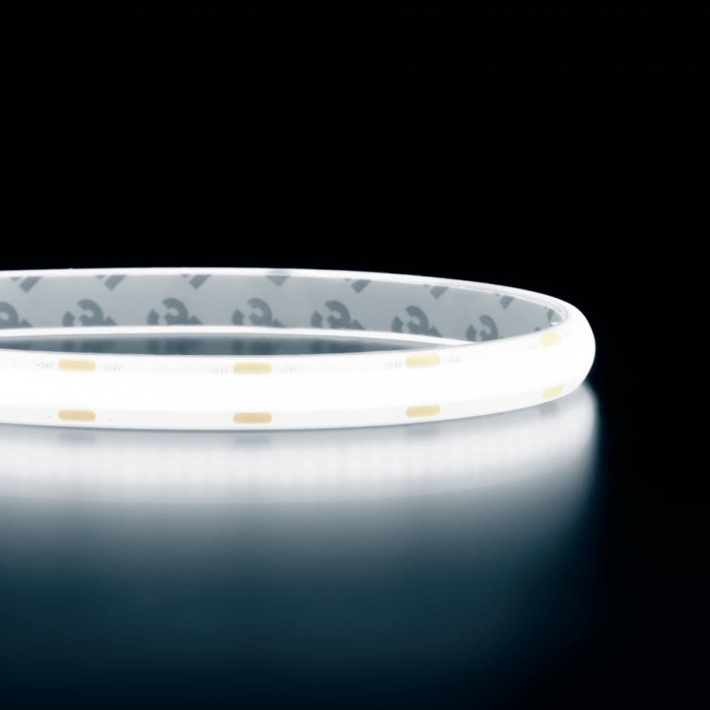 Ce ruban LED COB Performance se distingue par son silicone blanc, une alternative plus moderne au diffuseur jaune que l’on retrouve habituellement sur les rubans LED. Cette finition soignée lui confère un aspect contemporain et discret, même lorsqu’il est éteint.