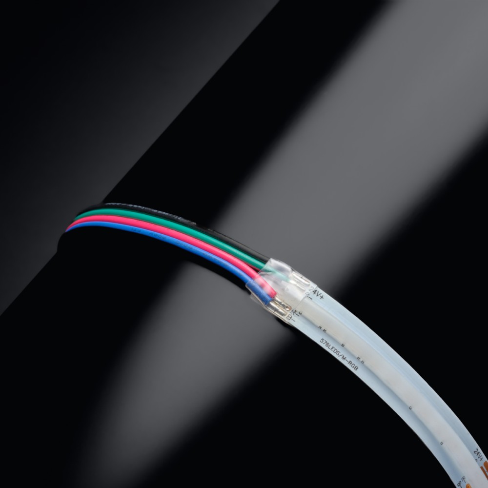 Le branchement de ce ruban se fait sur 4 fils (0 V / +12 V / Data / Clock). Cette technologie permet de piloter une longueur quasi infinie de rubans LED en ré-alimentant le ruban tous les 5 mètres. Afin de faciliter l'installation du ruban, des connecteurs sont disponibles à chaque extrémité. De plus, le ruban est équipé d'un adhésif 3M pour faciliter sa pose.