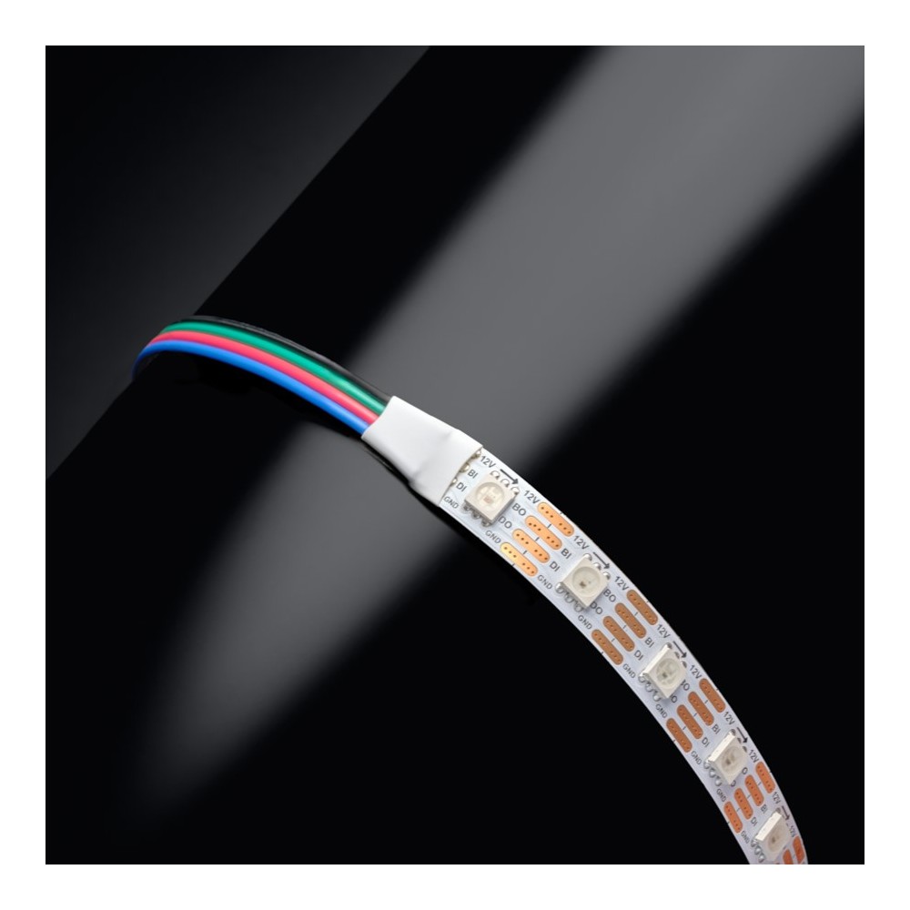 Le branchement de ce ruban se fait sur 3 fils (0 V / +12 V / Data). Cette technologie permet de piloter une longueur quasi infinie de rubans LED en ré-alimentant le ruban tous les 5 mètres. Afin de faciliter l'installation du ruban, des connecteurs sont disponibles à chaque extrémité. De plus, le ruban est équipé d'un adhésif 3M pour faciliter sa pose.