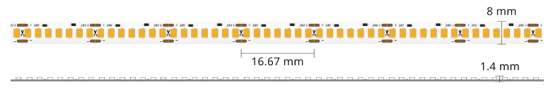 Ce bandeau LED intègre une nouvelle technologie : une taille de puce LED "2216", plus compacte que les rubans à puces LED de taille classique "2835". Cette petite taille de LED permet de placer beaucoup plus de puces LED sur un même espace, éliminant ainsi l'effet de points lumineux visible, pour une équivalence visuelle aux rubans COB.