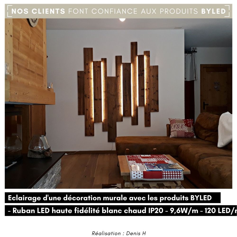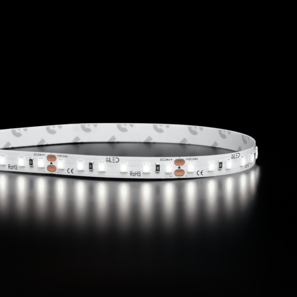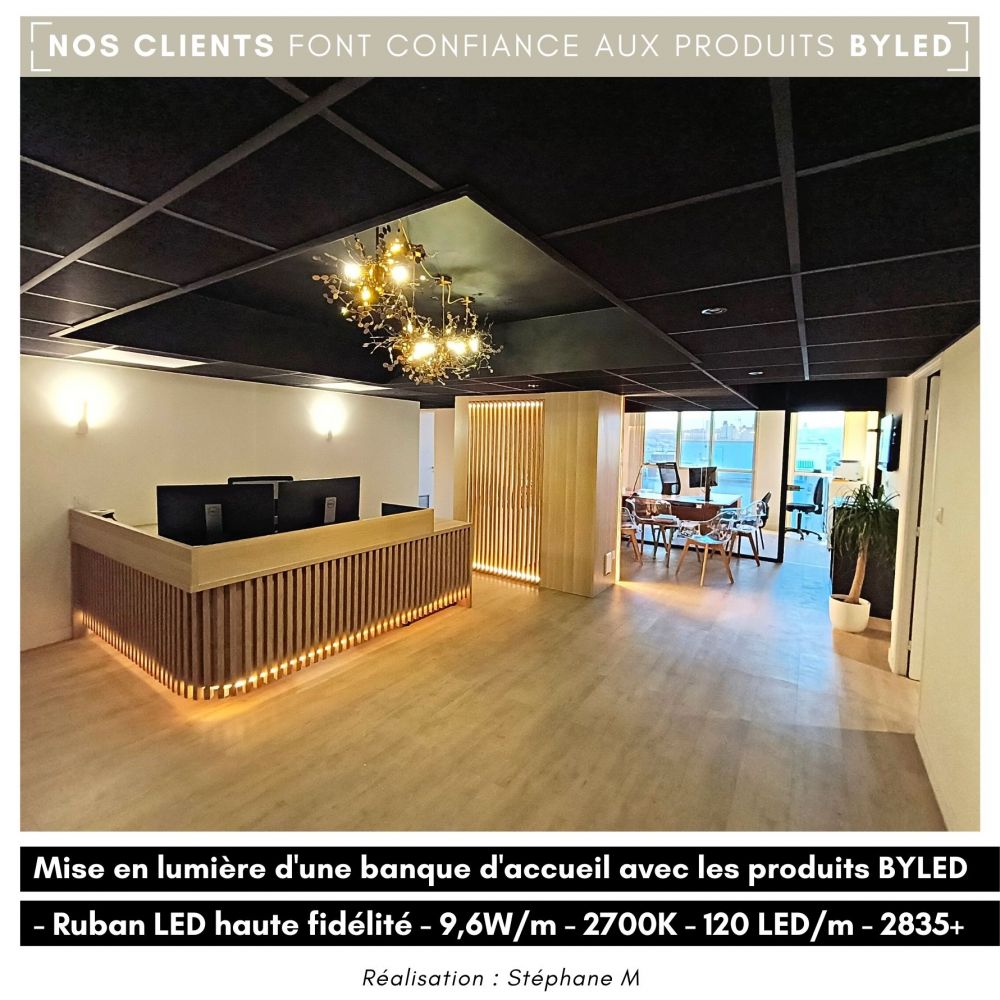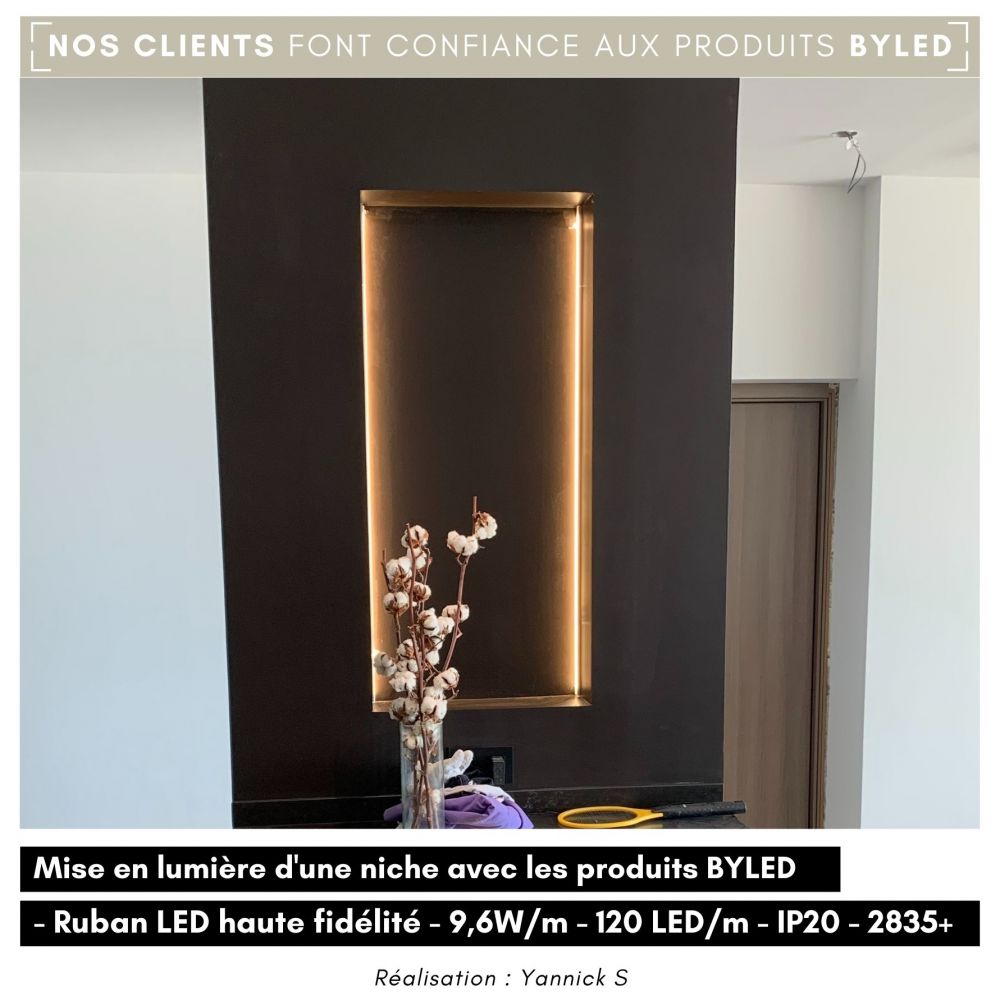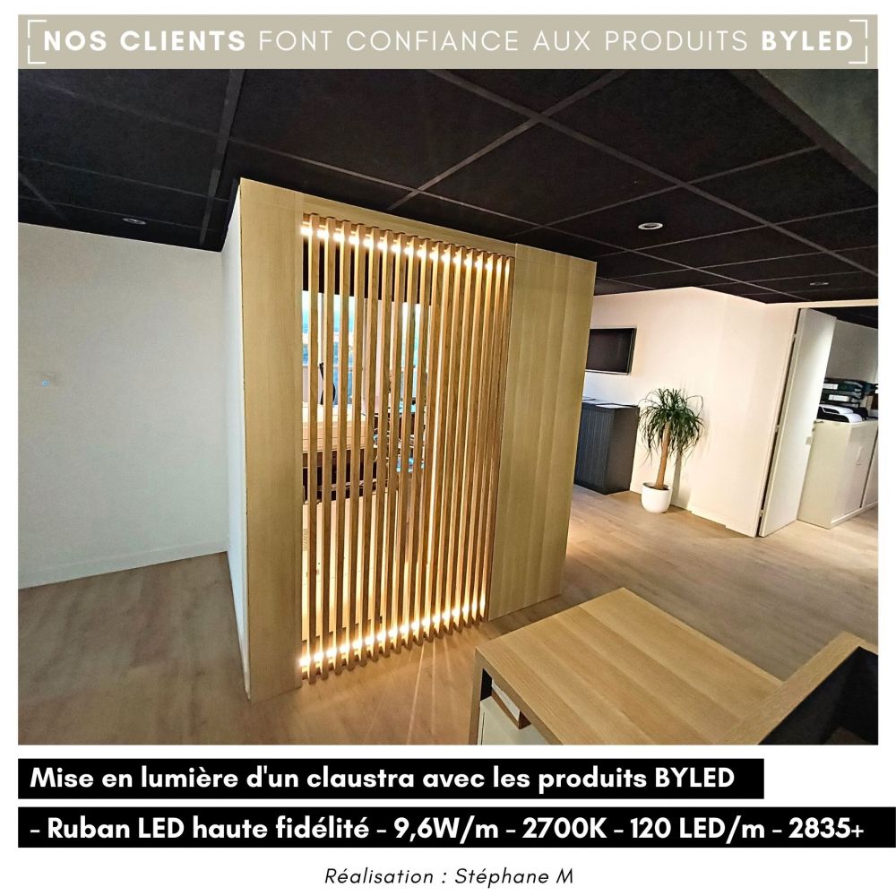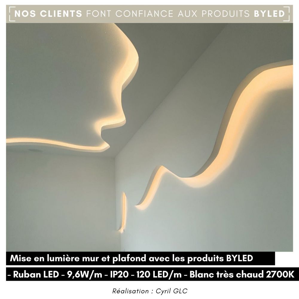 De par son intensité lumineuse moyenne, le bandeau ByLED 2835 9,6W/m, avec 120 LED/mètre, s'intègre parfaitement dans un placard, un dressing ou pour l'éclairage d'un plan de travail. Vous bénéficiez ainsi d'un éclairage adapté avec un rendu esthétique et très moderne. Pour lisser encore plus la diffusion de la lumière et obtenir un effet néon, nous vous conseillons d'intégrer votre ruban dans un profilé pour ruban LED au diffuseur givré.