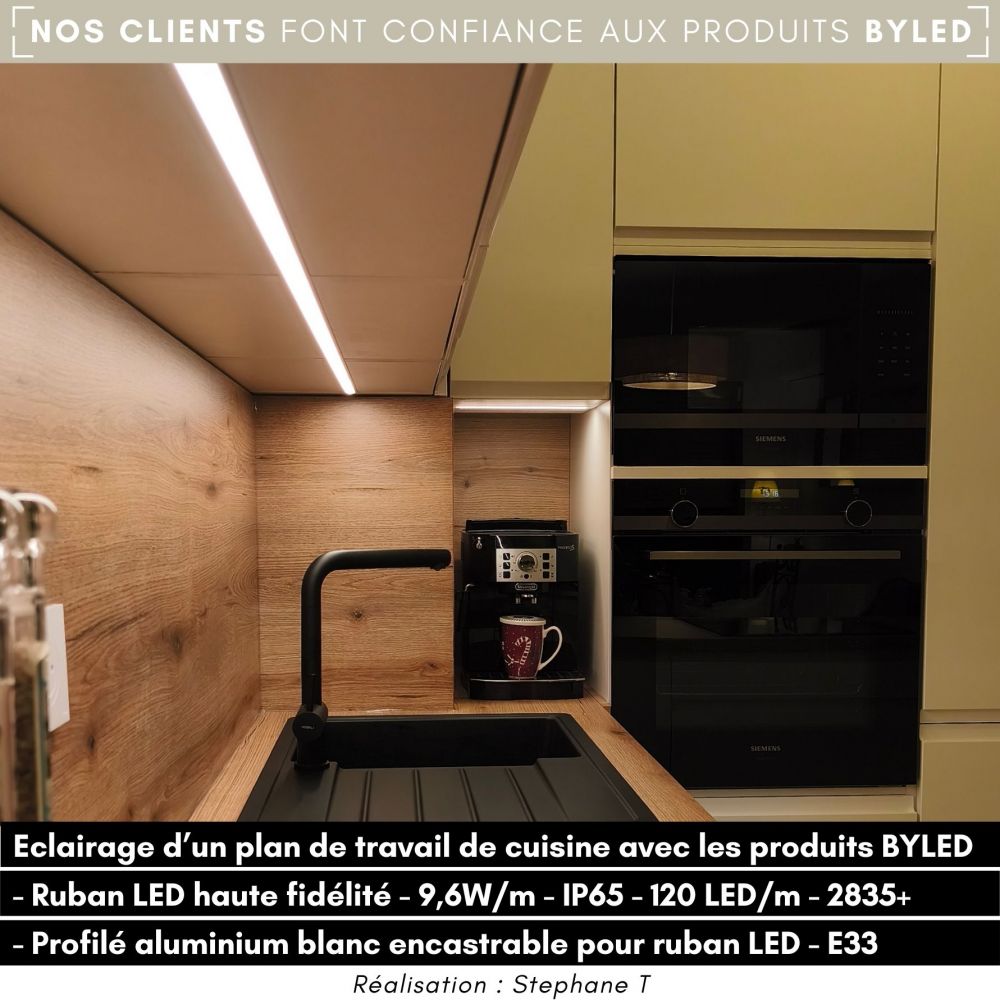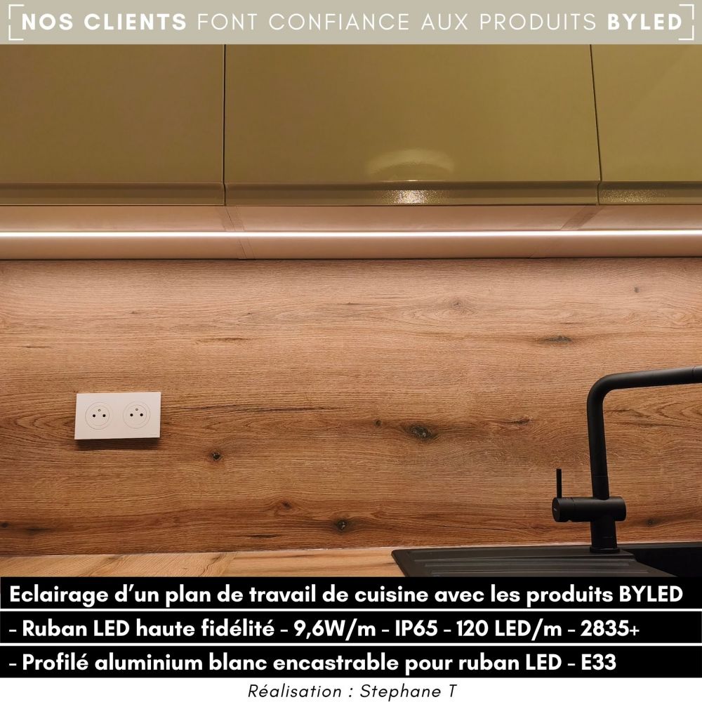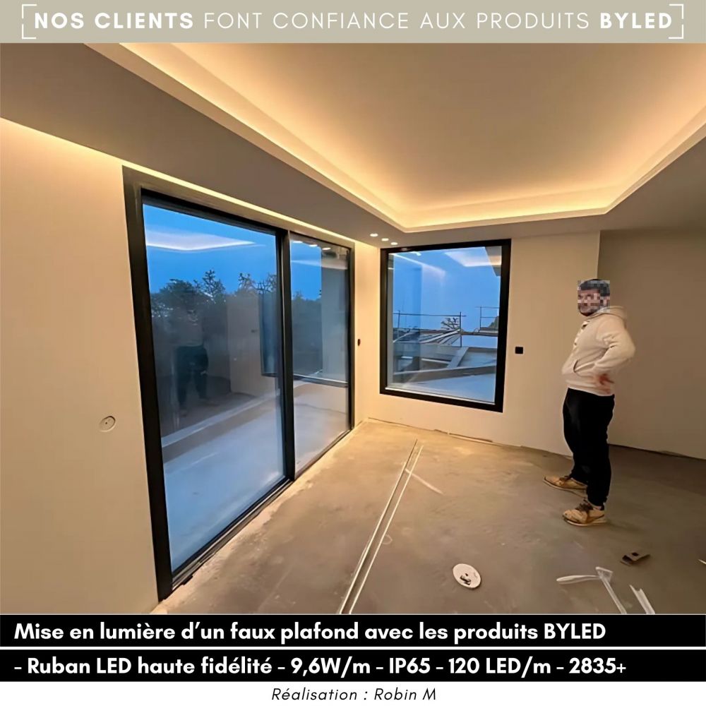De par son intensité lumineuse moyenne, le bandeau ByLED 2835+ 9,6W/m, avec 120 LED/mètre, s'intègre parfaitement dans un placard, un dressing, au plafond d'une petite salle de bain, dans un profilé ou encore pour l'éclairage d'un plan de travail. Vous bénéficiez ainsi d'un éclairage adapté avec un rendu esthétique et moderne. Pour lisser la diffusion de la lumière et obtenir un effet néon, nous vous conseillons d'intégrer votre ruban dans un profilé pour ruban LED au diffuseur givré.
