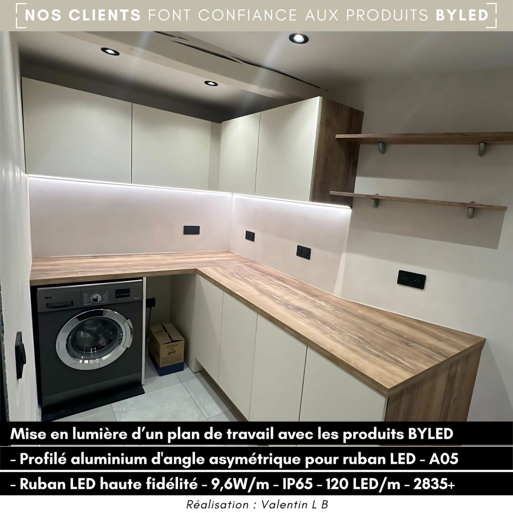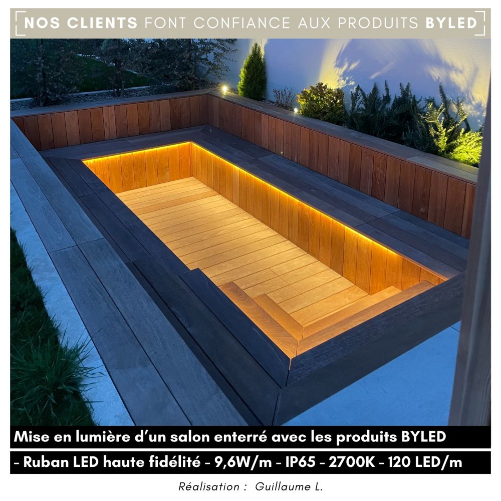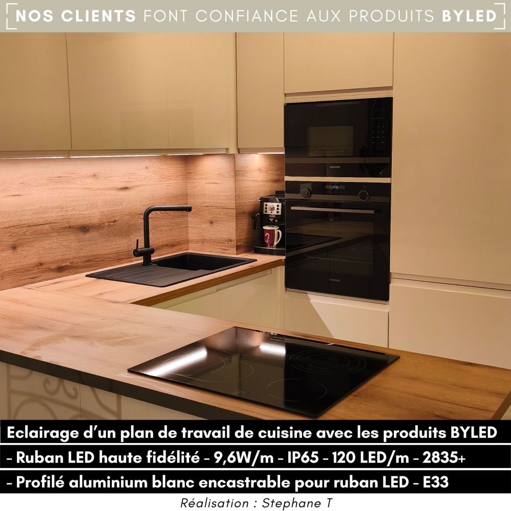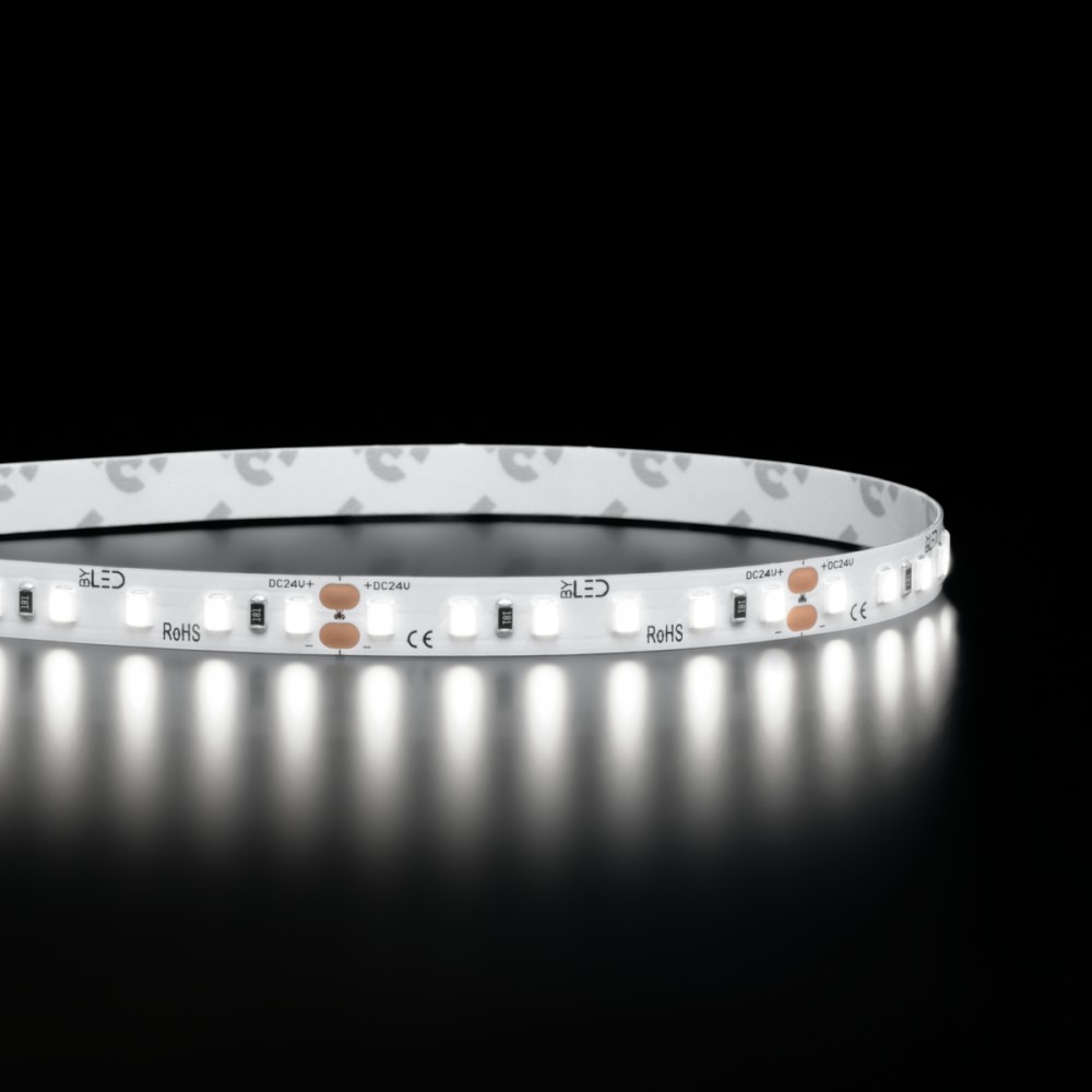 De par son intensité lumineuse moyenne, le bandeau ByLED 2835+ 9,6W/m, avec 120 LED/mètre, s'intègre parfaitement dans un placard, un dressing, au plafond d'une petite salle de bain, dans un profilé ou encore pour l'éclairage d'un plan de travail. Vous bénéficiez ainsi d'un éclairage adapté avec un rendu esthétique et moderne. Pour lisser la diffusion de la lumière et obtenir un effet néon, nous vous conseillons d'intégrer votre ruban dans un profilé pour ruban LED au diffuseur givré.