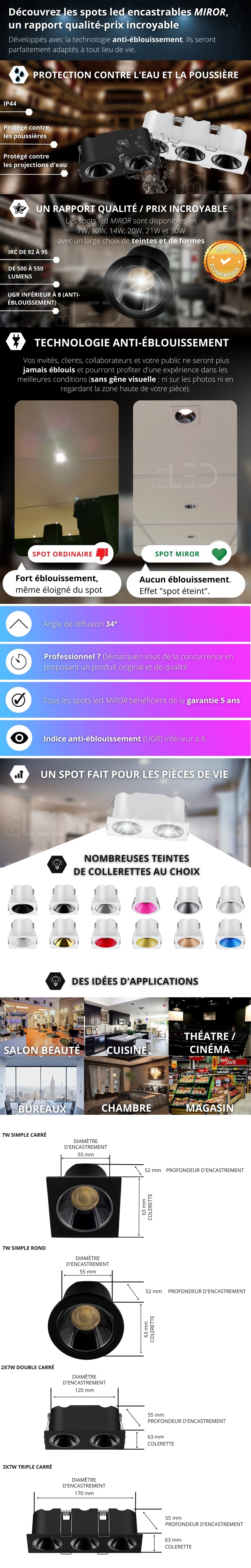 Si vous recherchez des spots LED pour les pièces de votre habitation ou pour un établissement (bureaux, commerces, cabinet, salle de spectacle etc.), aux exigences économiques, écologiques et moderne, alors, les spots d'intérieur encastrables Miror sont fait pour vous.