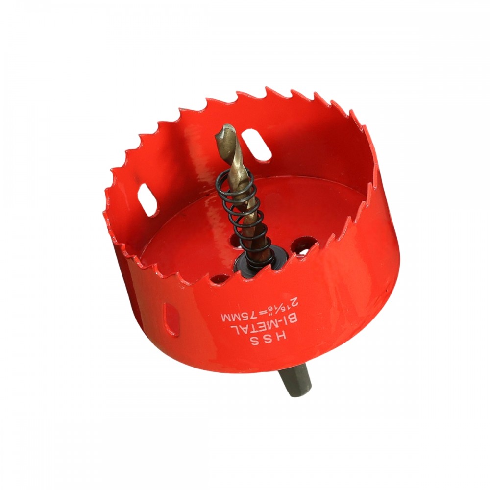 Cette scie cloche de 75mm est équipée d'un foret de centrage muni d'un ressort d'évacuation qui éjectera automatiquement la pièce découpée.