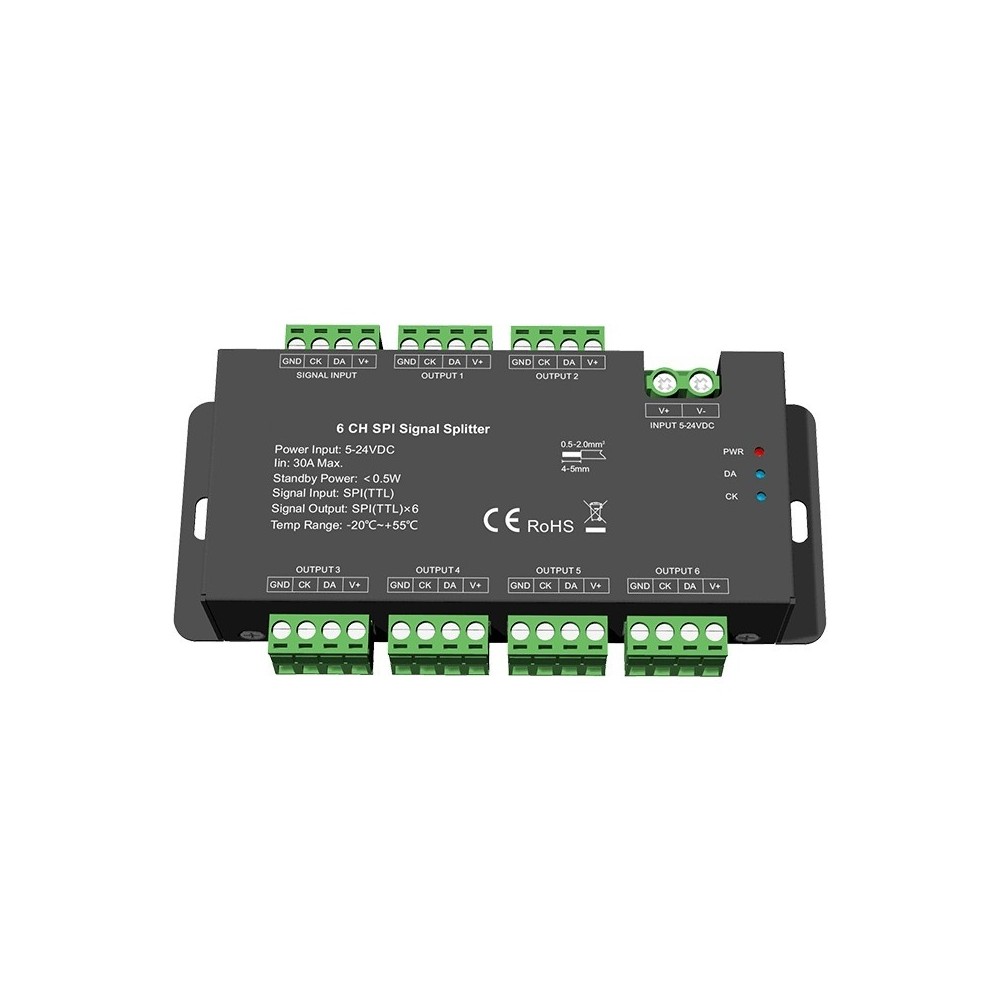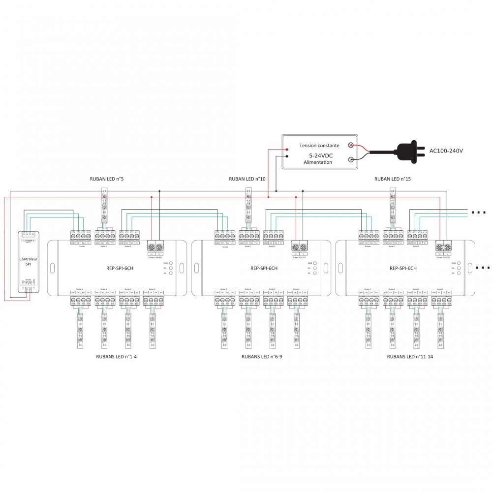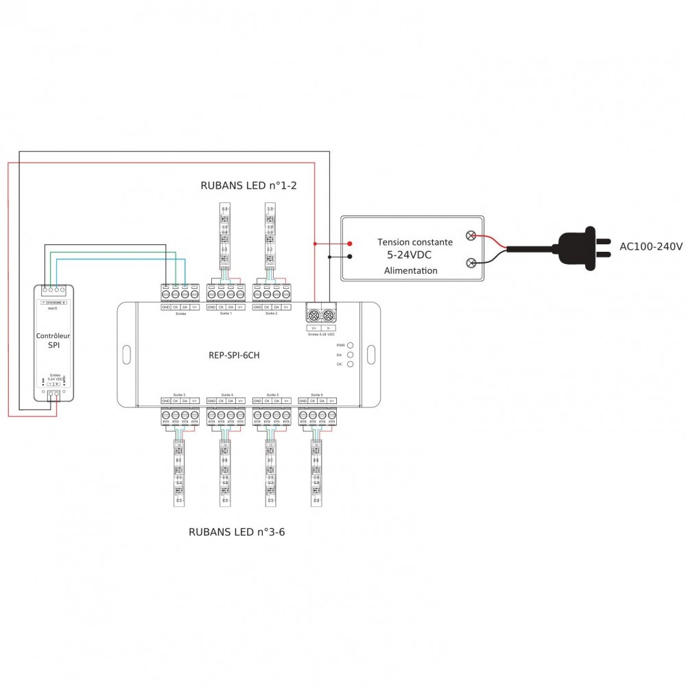 Concrètement, il duplique le signal data de votre contrôleur digital SPI afin d'éviter le problème de scintillement visible lorsque vous branchez plusieurs lignes de rubans LED SPI sur un seul contrôleur.