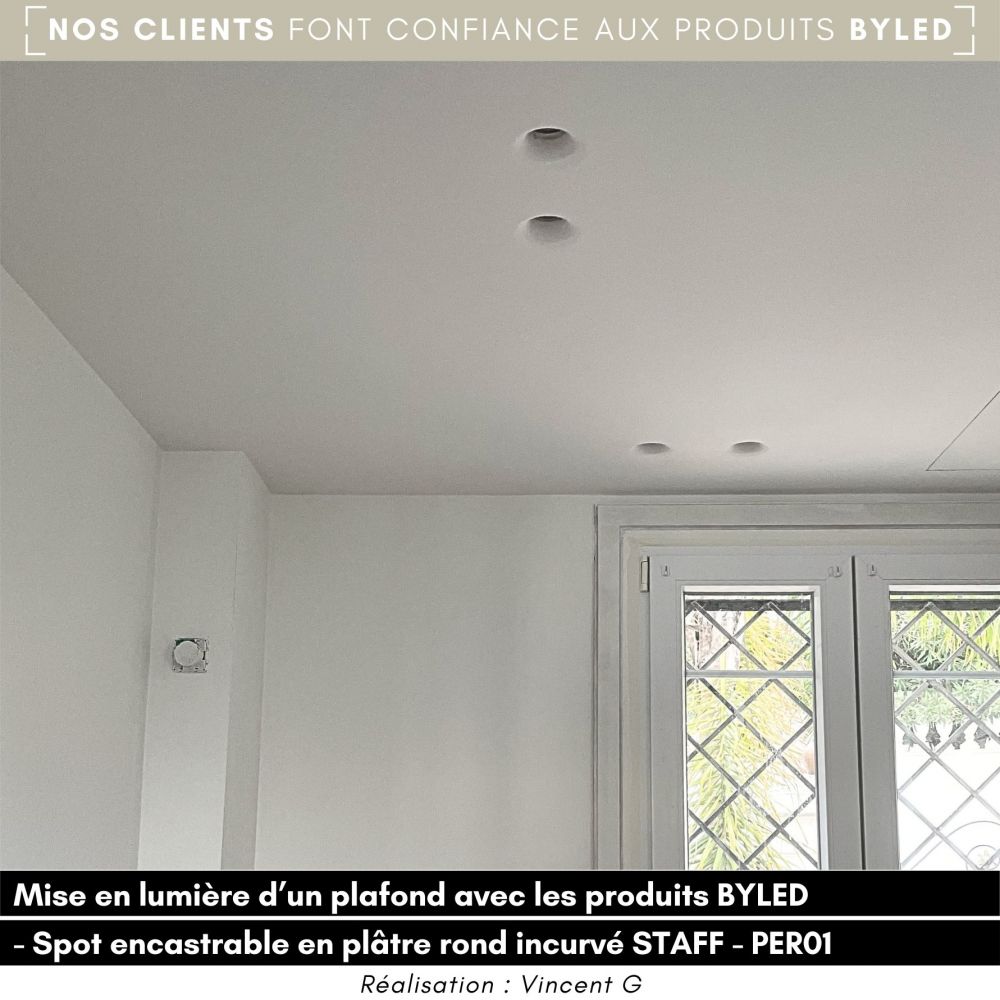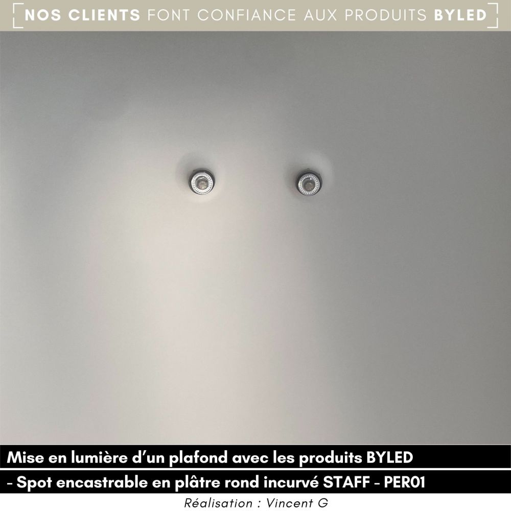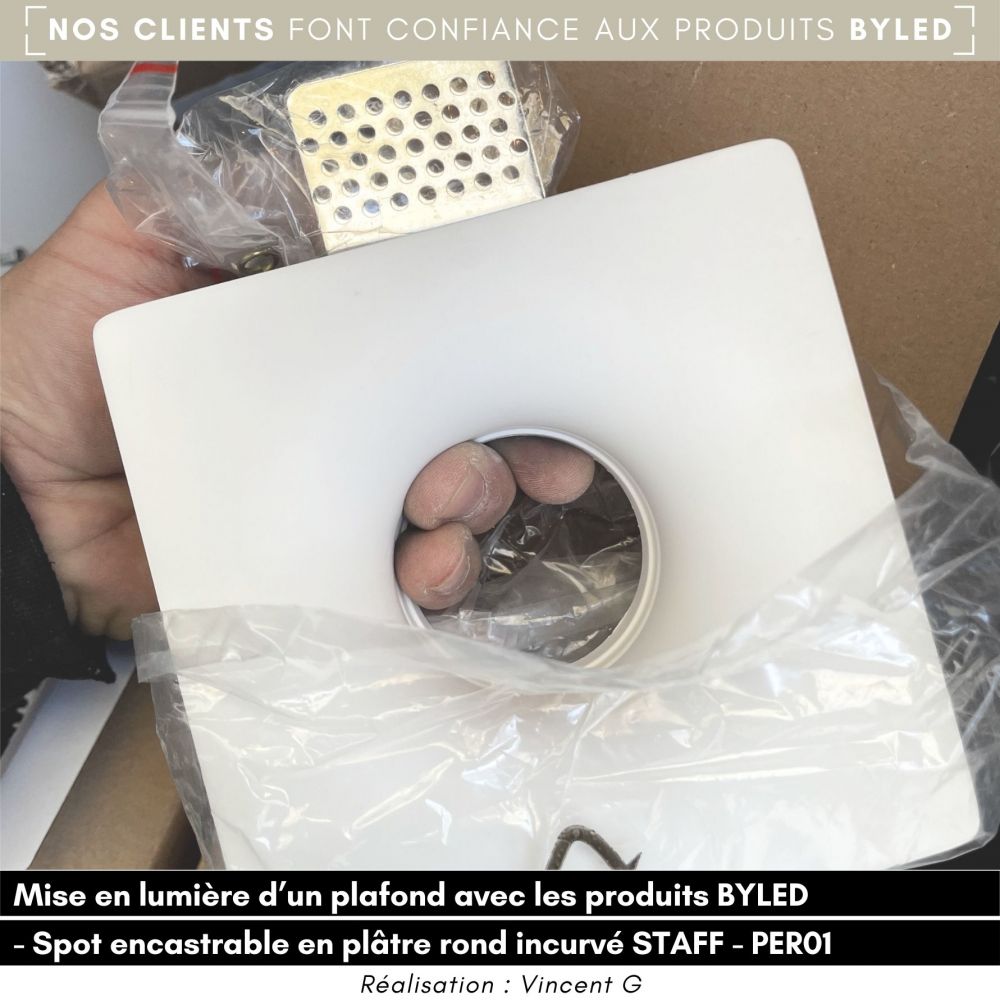 Nos sources lumineuses Spark, grâce à leur collerette blanche sont particulièrement adaptées aux spots en plâtre STAFF afin d'obtenir une discrétion absolue du plafond jusqu'à la LED. De plus, nos encastrés sont fournis avec un clip de maintien transparent, pour un résultat encore plus discret.