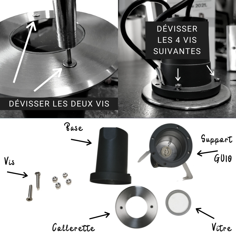 Le pot (partie en plastique noire) devra être enlevé de l'appareil. L'accès aux vis du pot se fait en dévissant la collerette inox du spot. Si la dalle n'est pas encore construite, il conviendra de prévoir le passage des câbles électriques sous gaine selon les normes en vigueur. Une réservation devra être prévu à l'aide de tube PVC d'un diamètre correspondant au corps du spot (voir notice). La profondeur de cette réservation devra permettre d’encastrer le spot et la boite de dérivation, le cas échéant. Un drainage suffisant (gravier ou tube d'évacuation) devra être réalisé afin d'éviter la stagnation de l'eau sous le spot. Une attention particulière (étanchéité) devra être porté aux connexion électriques si celles-ci sont enterrées (Voir notice).