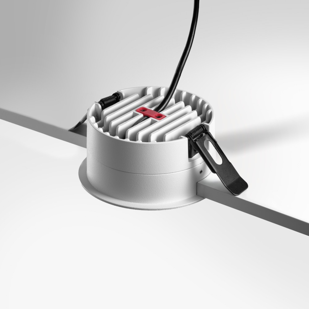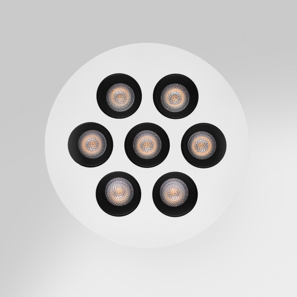 Une fois installé, le produit apparaît comme un disque blanc mat qui se fond dans la surface du plafond. On remarque ses sept ouvertures circulaires qui rythment la forme ronde du luminaire de manière soignée. On peut l'aligner pour dessiner une ligne directrice dans un couloir ou le disposer dans une grande pièce. Sa silhouette épurée complète l'agencement intérieur pour un résultat visuel maîtrisé et cohérent.