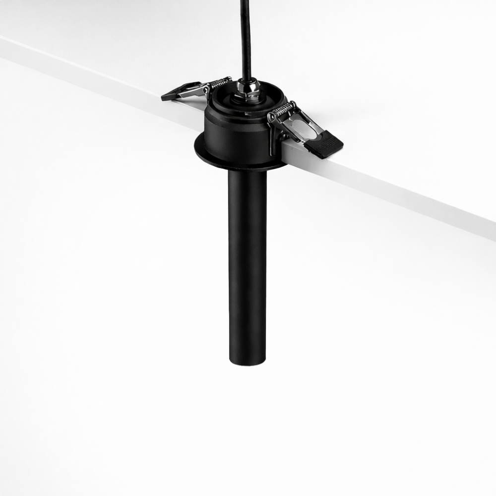 Une fois installé, le produit apparaît comme un tube court noir mat. Sa silhouette compacte s'intègre harmonieusement en offrant une ligne visible et soignée. On peut l'installer dans l'axe pour un rendu droit ou l'orienter légèrement afin de diriger la lumière vers une zone choisie.