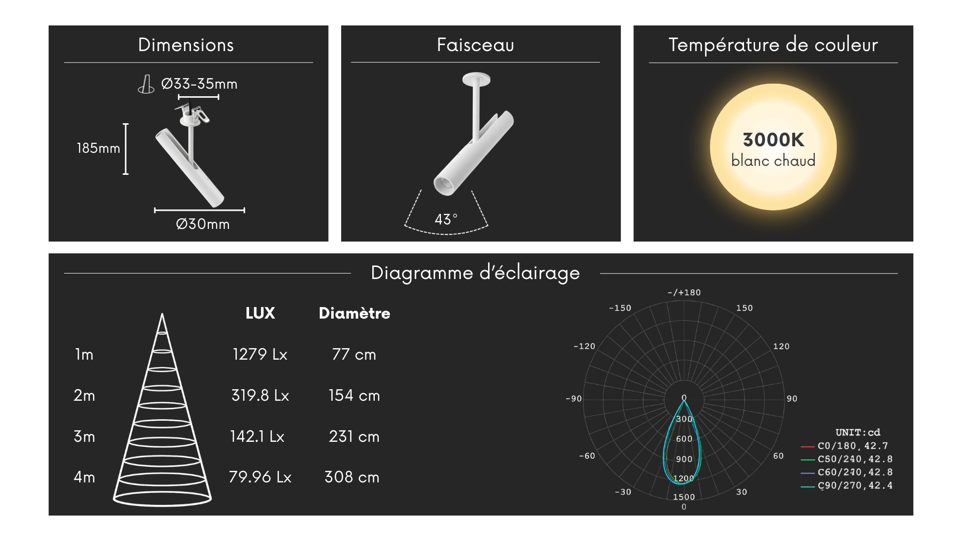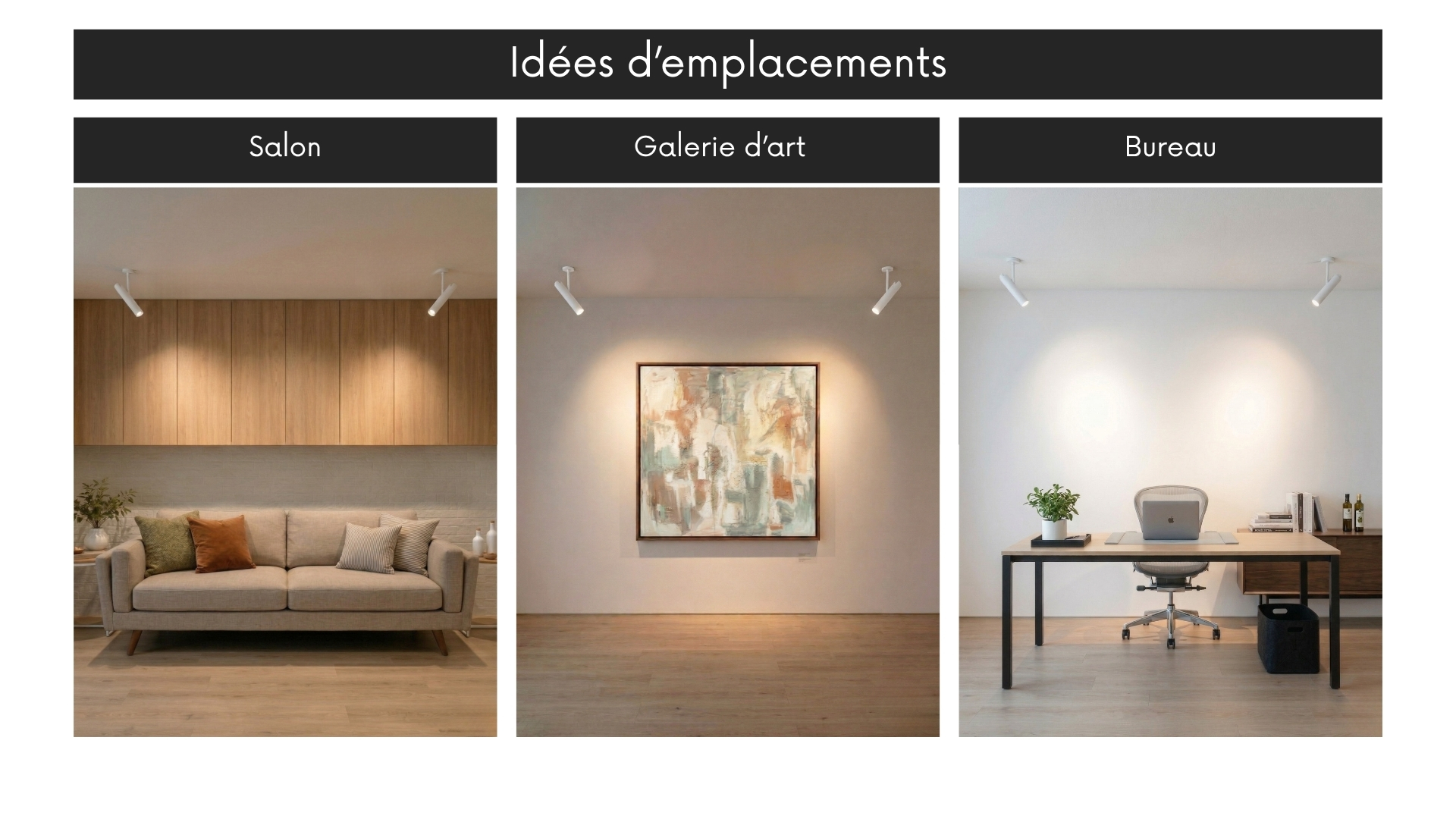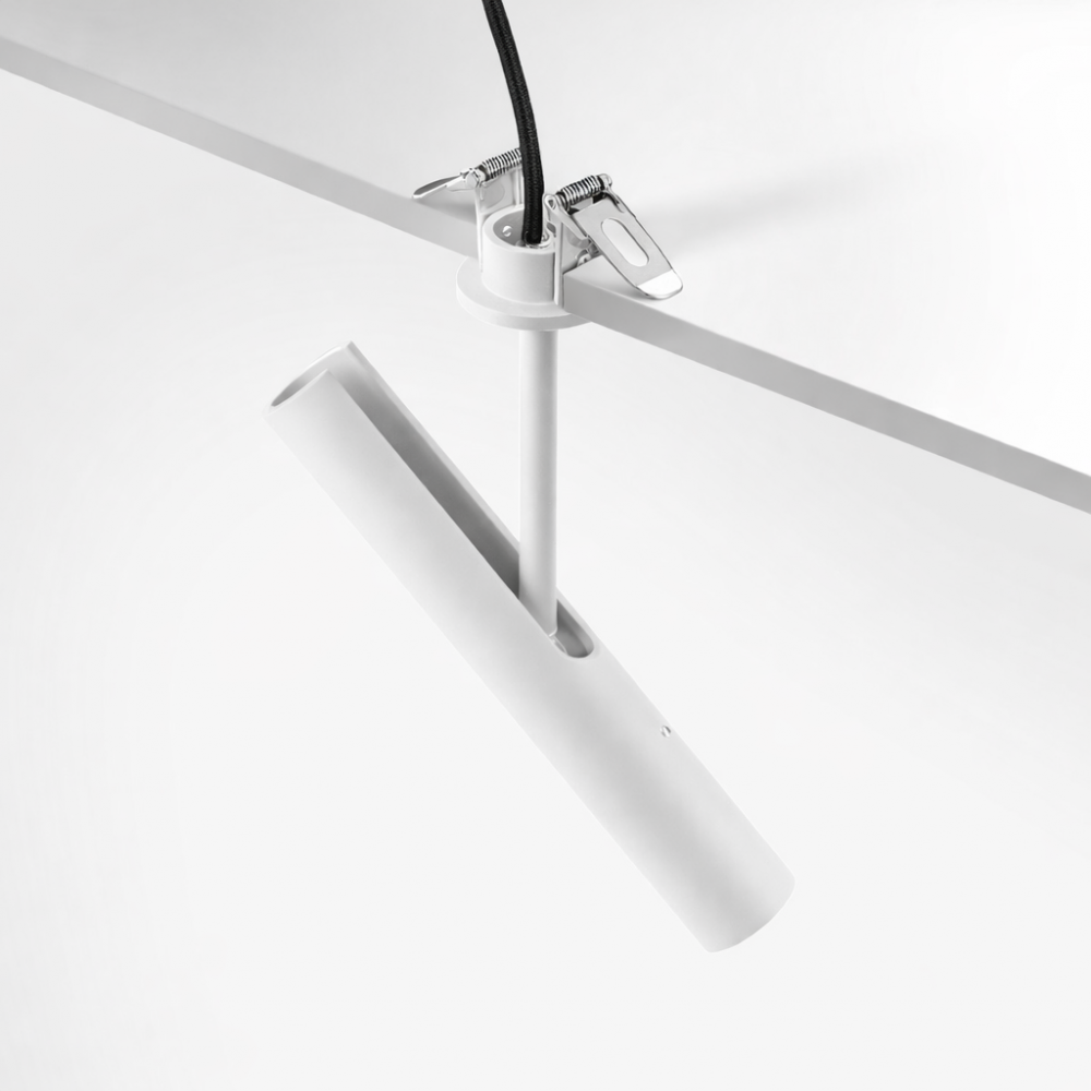 Une fois installé, le produit se présente comme un cylindre blanc mat suspendu par une tige fine à une base circulaire discrète. Sa forme épurée s'intègre harmonieusement à la surface du plafond tout en offrant une ligne visible et soignée. On peut l'installer dans l'axe pour un rendu droit ou l'orienter précisément afin de diriger la lumière vers une zone choisie.