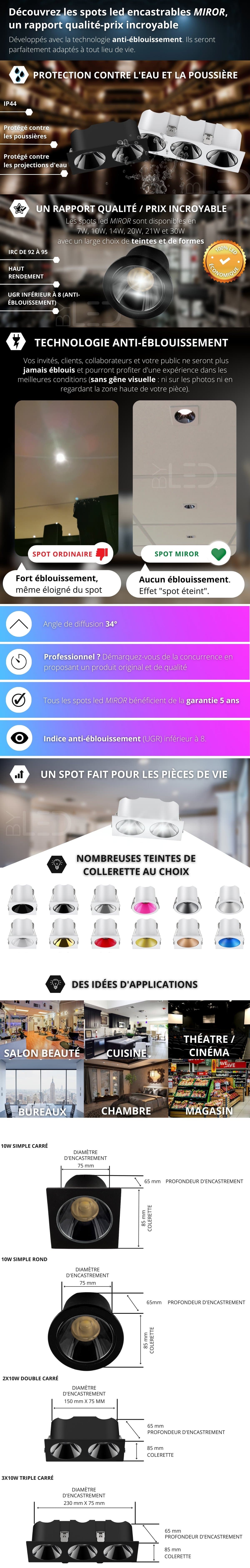 Si vous recherchez des spots LED pour les pièces de votre habitation ou pour un établissement (bureaux, commerces, cabinet, etc.), aux exigences économiques, écologiques et moderne, alors, les spots d'intérieur encastrables Miror sont fait pour vous.