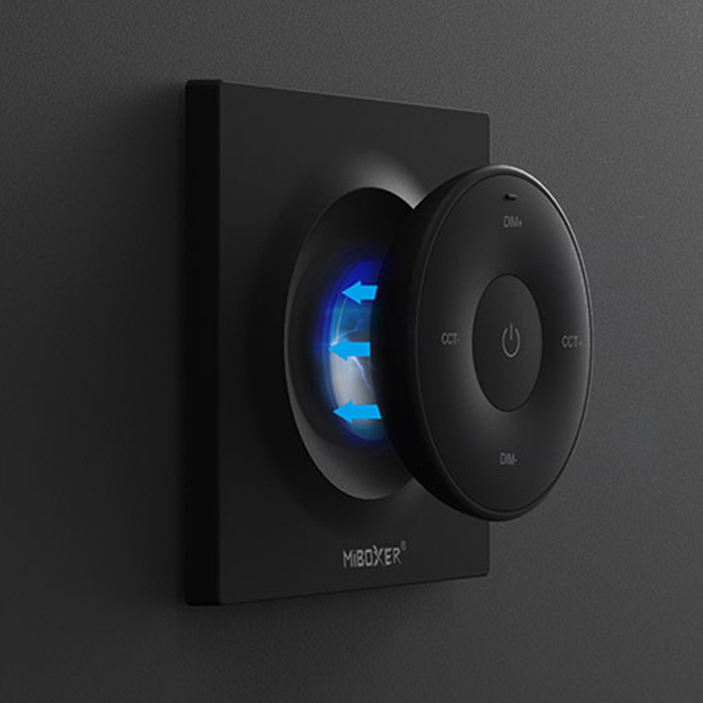 Très pratique, la télécommande MiBoxer K2 permet de gérer votre éclairage dans un rayon de 30 mètres sans passer de fils électriques ni faire de trou dans le mur. Elle se positionne sur son support mural magnétique pour une utilisation comme interrupteur mural. Détachable, elle permet également de s'utiliser comme une télécommande portative.