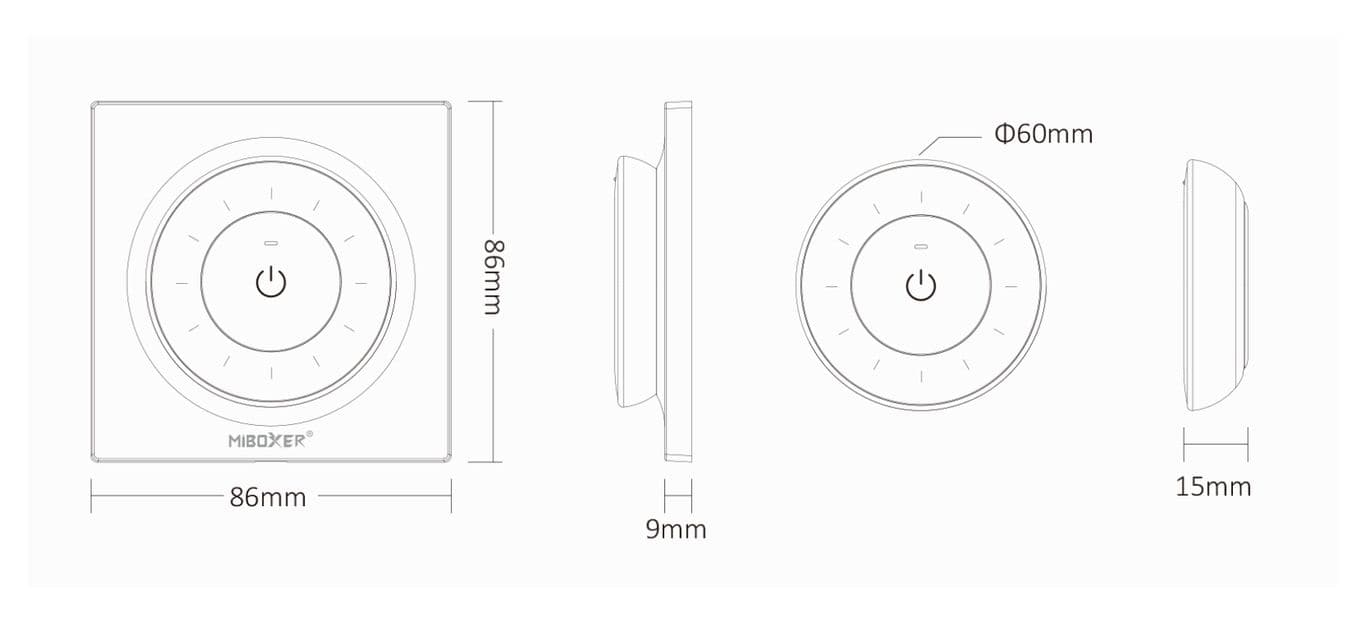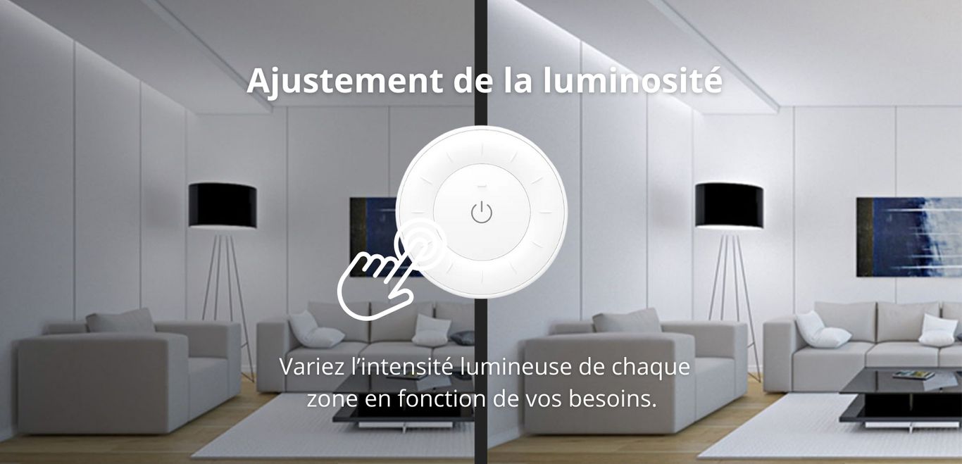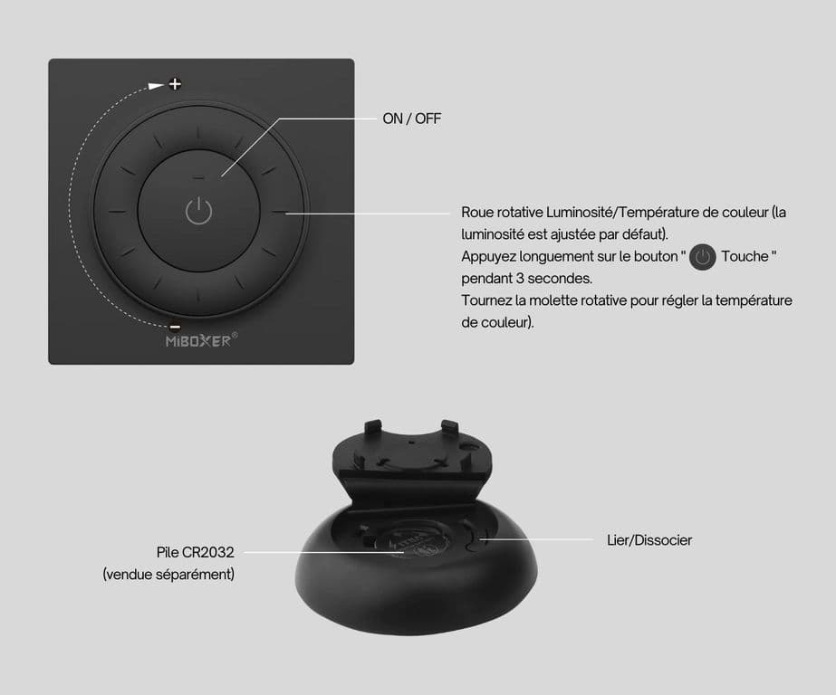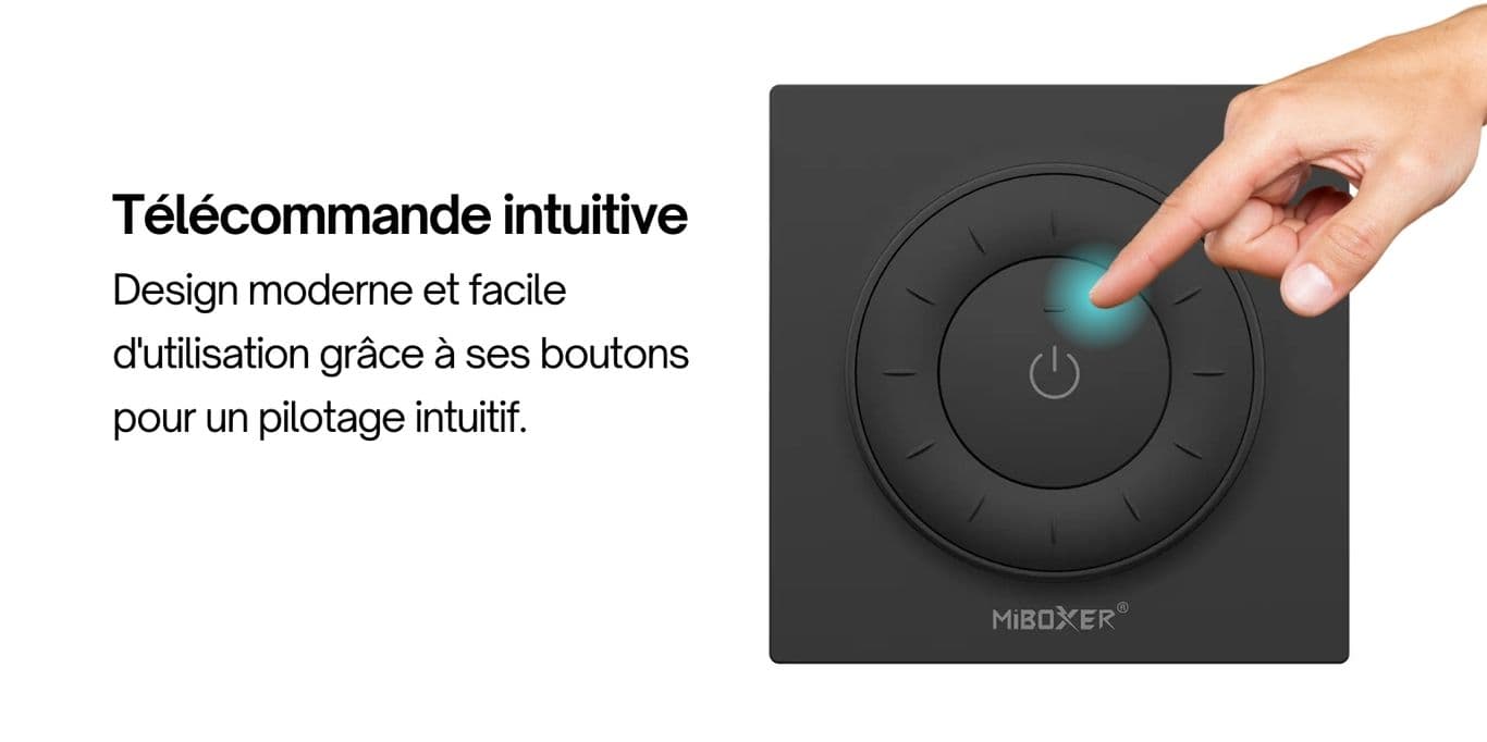 Très pratique, la télécommande MiBoxer K3 permet de gérer votre éclairage dans un rayon de 30 mètres sans passer de fils électriques ni faire de trou dans le mur. Elle se positionne sur son support mural magnétique pour une utilisation comme interrupteur mural. Détachable, elle permet également de s'utiliser comme une télécommande portative.