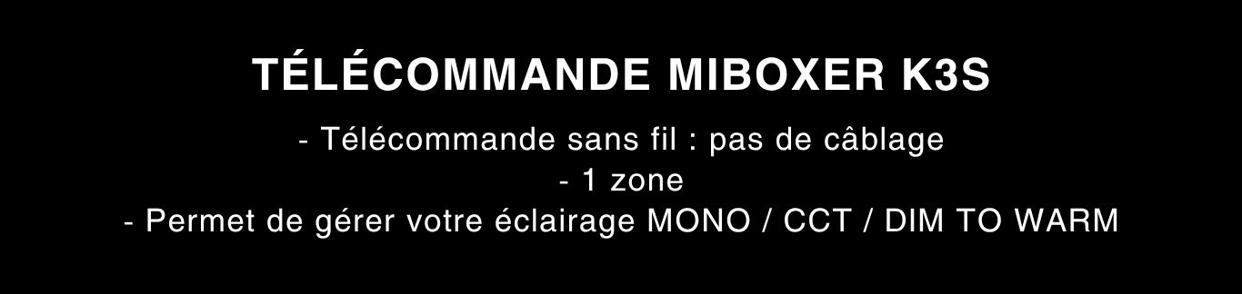 Pour piloter vos éclairages en très basse tension (5/12/24/48V) ou en 230V, votre télécommande MiBoxer K3S doit impérativement être associée à un contrôleur MiBoxer compatible.